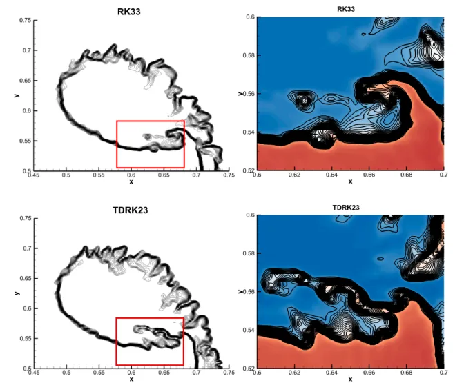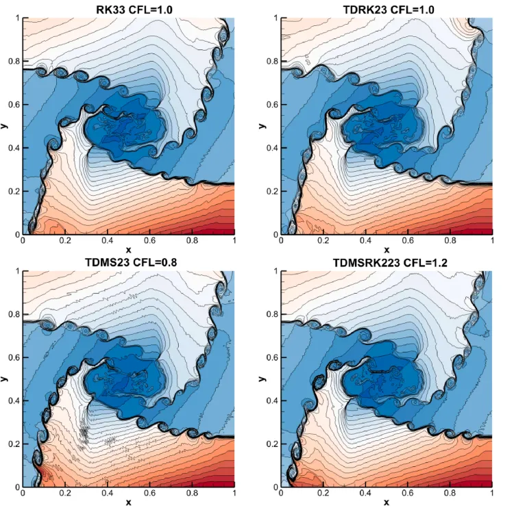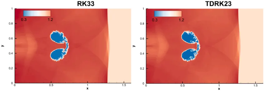 本文中,南京航空航天大学吴杰教授提出了一种结合五阶TENO空间重构与基于圆函数的气体动理学通量求解器(C-GKFS)的高阶数值格式,用于可压缩流动的高效高精度模拟。该方法通过引入基于二导数的多步/多阶段时间离散格式(如TDMSRK、TDRK和TDMS),并结合强稳定性保持时间系数与Lax-Wendroff时空耦合策略,在保持三阶时间精度的同时显著减少了函数评估次数,降低了计算复杂度和数值耗散。数值实验表明,该方法在激波捕捉、流动细节分辨率和计算效率方面均优于传统格式,尤其在激波-气泡相互作用和无粘三维Taylor-Green涡等复杂流动模拟中展现出良好的应用潜力。研究成果以“High-order gas-kinetic scheme with two-derivative-based time discretization for compressible flows”为题发表于旗舰期刊Computers & Fluids。本文第一作者:南京航空航天大学Qiushuo Qin传统气体动理学格式(GKS) 基于Boltzmann-BGK方程,具有多尺度、低耗散等优点,但其通量计算复杂、计算成本高。C-GKFS的提出:通过圆函数简化Maxwellian分布,降低计算复杂度,但仍需配合高阶时空格式以提升整体精度。高阶需求:传统时间格式(如RK33)在配合高阶空间重构(如TENO)时,计算量大、稳定性受限,亟需更高效的时间推进方法。空间离散:采用五阶TENO重构,相比WENO具有更低耗散和更高的小尺度结构分辨能力。通量求解:基于圆函数的气体动理学通量求解器(C-GKFS),简化粒子速度空间,提高计算效率。TDMSRK223(两步两阶段Runge-Kutta)时空耦合:采用Lax-Wendroff型策略,用空间导数替代时间导数,避免复杂解析推导,增强一致性。传统GKS计算效率低:C-GKFS简化了通量计算,但仍需配合高阶时间格式以充分发挥优势。高阶时间格式计算成本高:传统Runge-Kutta方法需多次函数评估,二导数格式在保证三阶精度的同时减少迭代次数。激波与小尺度结构捕捉困难:TENO重构结合二导数时间格式,在激波区域保持单调性,同时在湍流、涡结构等区域提升分辨率。多步法启动问题:TDMS和TDMSRK需依赖前期时间步信息,文章采用TDRK23或RK22进行启动,保证计算流程完整。精度验证:在标量输运问题中,TDRK23、TDMS23、TDMSRK223均达到三阶精度,其中TDMSRK223误差最小。一维激波管问题:TENO重构相比WENO和第二阶格式更接近精确解,且在高CFL数下仍保持稳定。多步法与强稳定性:在Sod、Blast Wave、Shu-Osher等问题中,SSP时间格式有效抑制了TENO引起的数值振荡。双马赫反射:TDMSRK223捕捉到更精细的涡结构,计算效率高于RK33。2D Riemann问题:TDRK23和TDMSRK223在激波与接触间断交界处分辨率更高,数值耗散更低。激波-氦气泡相互作用:TDRK23捕捉到更清晰的界面不稳定性和涡结构,密度分布更接近参考数据。3D Taylor-Green涡:二导数格式在相同网格下保留了更多小尺度结构,动能耗散更接近理论预期。首次将TENO重构与C-GKFS结合,在保证激波捕捉能力的同时提升小尺度结构分辨率。引入多类二导数时间格式(TDMSRK/TDRK/TDMS),并统一在强稳定性保持框架下,提升时间推进效率与稳定性。采用Lax-Wendroff型时空耦合策略,简化高阶时间导数的构造,提升方法与高精度空间重构的兼容性。在多组分与湍流问题中验证了方法的综合优势,展示了其在复杂可压缩流动中的工程应用潜力。图1:二维黎曼问题(配置6):不同时间推进格式下的密度等值线。图2:激波-氦气泡相互作用:t = 0.82 ms时刻的激波-气泡相互作用密度等值线图3:激波-氦气泡相互作用:RK33与TDRK23格式在t = 0.82 ms时刻的数值纹影图像及内部涡旋区域的局部放大本文通过耦合高阶TENO空间重构与基于双导数的时间离散方法,为C-GKFS(紧致气体动理学格式)发展了一种全高阶数值格式。通过引入采用强稳定性保持时间系数的TDMSRK223、TDMS23及TDRK23格式,所提方法显著减少了函数迭代次数并降低了计算成本。此外,采用Lax-Wendroff型时空耦合策略充分发挥了TENO格式提供的高分辨率空间重构优势。数值结果表明,该方法不仅能够精确捕捉激波并解析流动细节,还在保持高精度与鲁棒性的同时提升了计算效率。该技术为复杂可压缩流动的高保真度高效模拟提供了有效工具,展现出广阔的应用前景。—欢迎您的加入—