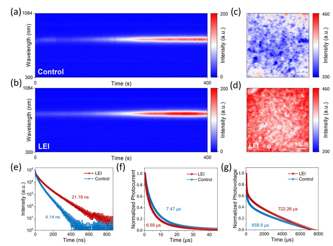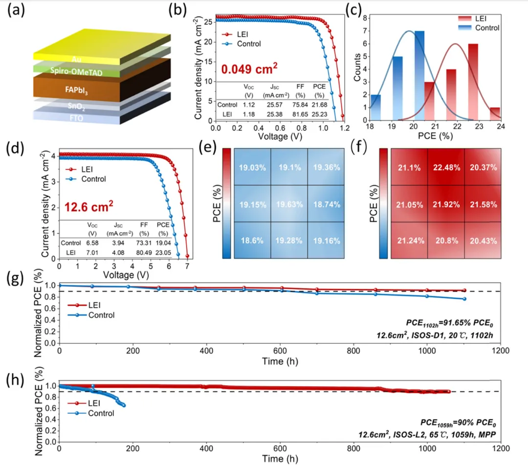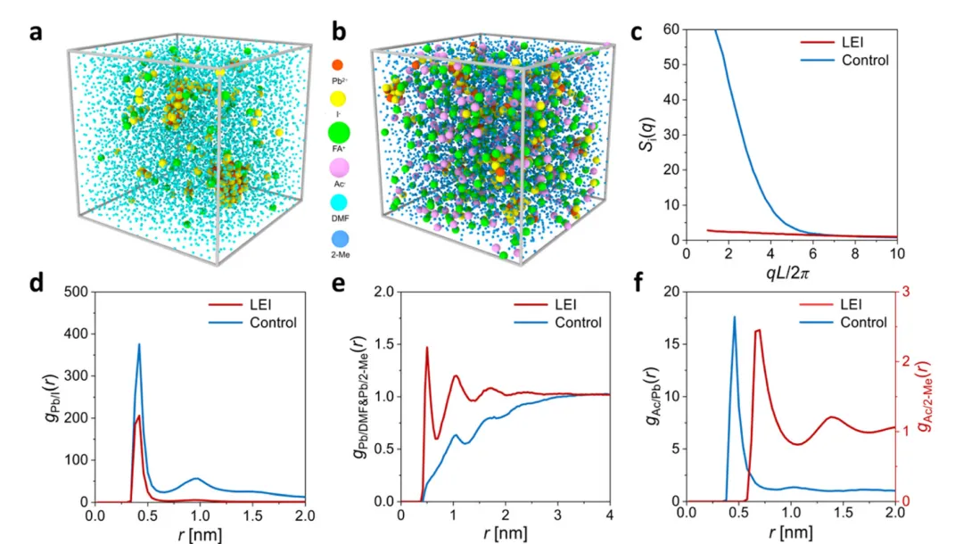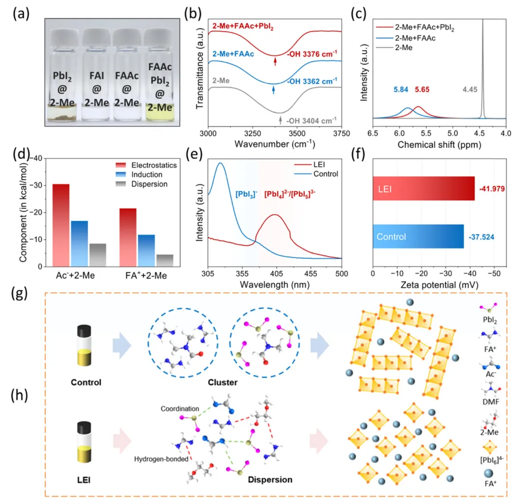 不含杂阳离子/阴离子的纯相α-甲脒铅碘(α-FAPbI₃)钙钛矿是高效、热稳定钙钛矿太阳能电池的理想吸光材料,但强配位溶剂易形成无序配位网络,提高墨水熵值并导致相转变路径低效。本研究开发了由2-甲氧基乙醇(2-Me)和甲脒乙酸盐(FAAc)组成的固-液低熵墨水(LEI),实现了大气环境下纯相α-FAPbI₃薄膜的制备。FAAc与Pb²⁺强配位,2-Me与FAI间的氢键促进FA⁺分散,抑制了[PbI₃]⁻杂相形成,实现低残留溶剂的快速纯相结晶,同时缓解了溶剂化诱导的相杂质和埋入界面降解问题。基于该策略的小面积(0.049 cm²)钙钛矿太阳能电池光电转换效率(PCE)达25.23%,5×5 cm²模组效率达23.05%,均为纯相α-FAPbI₃体系的最高值;模组在最大功率点跟踪连续光照1000 h后仍保持90%初始效率,展现出优异的稳定性,为高性能钙钛矿光伏器件的制备提供了新路径。纯相α-FAPbI₃因带隙最优,是接近肖克利-奎伊瑟极限的钙钛矿太阳能电池理想吸光材料,且无杂离子掺杂可避免组分偏析,具备优异的热稳定性。但纯相α-FAPbI₃的相转变过程难度大、势垒高,相比杂化阳离子体系,更易发生有害相转变,导致前驱体转化不完全、结晶不均匀,成为其性能提升的关键瓶颈,因此改善纯相FAPbI₃前驱体墨水的相转变行为是制备高质量钙钛矿薄膜的核心需求。传统前驱体墨水采用DMF、DMSO、NMP等强配位溶剂,这类溶剂可与几乎所有前驱体发生配位,使前驱体溶液处于高熵、无序的离子状态,形成低效的无序相转变路径,前驱体难以克服能垒形成有序晶格。溶剂与Pb²⁺的强配位会生成[PbI₃]⁻络合物,易形成低生成能的δ-FAPbI₃杂相,降低钙钛矿结构稳定性和载流子迁移率,还会诱发FA⁺迁移与挥发。同时,高配位溶剂的高熵特性使其难以从富溶剂薄膜中完全挥发,残留于埋入界面会直接导致钙钛矿快速降解,严重制约器件性能与稳定性。本研究开发了由2-甲氧基乙醇(2-Me)和甲脒乙酸盐(FAAc)组成的低熵墨水(LEI),实现大气环境下纯相α-FAPbI₃薄膜的可控制备。在LEI体系中,FAAc与Pb²⁺强配位,破坏有害的[PbI₃]⁻络合并活化Pb–I骨架,2-Me与FAI间的强氢键实现墨水内FA⁺的均匀分布;有序的相互作用降低了前驱体溶液的熵无序性,实现低残留溶剂的α-FAPbI₃快速纯相结晶,有效解决刮涂工艺中的富溶剂问题。基于LEI的小面积(0.049 cm²)钙钛矿太阳能电池PCE达25.23%,5×5 cm²(12.6 cm²)大尺寸模组PCE达23.05%,为目前纯相α-FAPbI₃模组的最高效率;该模组在最大功率点连续运行1059 h后,仍保持90%以上的初始效率,展现出优异的长期稳定性。选择低给体数的2-Me为前驱体溶剂,引入FAAc可显著提升PbI₂在2-Me中的溶解度;红外与核磁表征证实2-Me与FAAc间形成氢键,而PbI₂的加入会因FAAc与Pb²⁺的强配位削弱该氢键,Ac⁻优先与Pb²⁺配位并促进铅碘骨架的活化。DFT计算表明2-Me与FAAc的氢键由Ac⁻介导,PbI₂的引入会与Ac⁻形成更强的配位键,活化Pb–I八面体骨架;2-Me与FAI的氢键作用协同抑制[PbI₃]⁻络合物形成,避免δ-FAPbI₃杂相产生。LEI的zeta电位更负,增强了胶体颗粒间的静电排斥,抑制团聚并提升溶液铺展性,且其挥发温度低于DMF等传统溶剂,利于溶剂完全挥发和纯相FAPbI₃形成。粗粒化分子动力学(MD)模拟表明,传统DMF基墨水的Pb²⁺与I⁻易形成离子簇,生成[PbI₃]⁻杂相,且Pb²⁺在DMF中溶剂化作用弱;而LEI中FA⁺和Ac⁻的静电屏蔽效应可分散Pb²⁺/I⁻离子簇,2-Me与Pb²⁺的强静电吸引增强了Pb²⁺的溶剂化作用,稳定离子组分分散,从分子层面解释了LEI前驱体溶液的优异分散性。原位掠入射广角X射线散射(GIWAXS)测试显示,传统墨水制备的薄膜无法实现δ相到α相的完全转变,且存在强PbI₂衍射峰;而LEI基薄膜在20 s内即可完成δ→α纯相转变,无PbI₂杂相,且初始阶段即出现α-FAPbI₃信号。LEI通过促进FA⁺快速扩散、加速溶剂挥发、抑制溶剂-Pb²⁺络合,实现δ相成核的有效抑制,其制备的薄膜结晶度更高,沿901方向择优取向,且成核更快、晶体分布更均匀。SEM表征证实LEI基薄膜均匀致密、无PbI₂残留,表面粗糙度和界面孔隙率显著降低,缺陷密度减少,光吸收性能提升;Ac⁻与Pb²⁺的强配位活化Pb–I骨架,2-Me与FA⁺的氢键促进其扩散,退火后2-Me和Ac⁻快速挥发,最终形成高质量纯相FAPbI₃薄膜。LEI基薄膜在自然干燥和退火过程中,光致发光(PL)和吸收强度提升更快,相转变速率更高,PLmapping显示其结晶度和均匀性更优,大尺寸薄膜的PL峰强度一致性良好。时间分辨PL测试表明LEI基薄膜载流子寿命更长,非辐射复合和缺陷态密度显著降低;瞬态光电流和光电压测试证实,LEI基器件的电荷提取效率提升、载流子寿命延长,界面输运过程得到优化。在大气环境(25℃、30%RH)下采用刮涂法制备n-i-p结构器件,LEI基小面积(0.049 cm²)器件最优PCE达25.23%(Voc=1.18 V,Jsc=26.43 mA cm⁻²,FF=80.58%),显著高于传统器件的21.68%;12.6 cm²大尺寸模组最优PCE达23.05%,认证效率21.76%,为纯相α-FAPbI₃模组的最高值,且小尺寸器件的效率均匀性显著提升。稳定性测试表明,LEI基模组在ISOS-D标准下1100 h仍保持91%以上初始PCE,在ISOS-L2标准下最大功率点连续光照1059 h后仍保留90%初始PCE,远优于传统器件的稳定性。本研究通过固-液低熵墨水(LEI)策略成功制备出高质量纯相α-FAPbI₃钙钛矿薄膜,利用2-Me与FAAc对钙钛矿前驱体的配位调控,有效抑制了溶剂对前驱体相转变和结晶过程的干扰。有序的配位作用显著加速了结晶动力学过程,避免了未反应