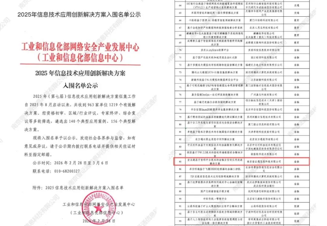 近日,工业和信息化部网络安全产业发展中心发布《2025年信息技术应用创新解决方案入围名单公示》,南京壹证通信息科技有限公司(以下简称“南京壹证通”)基于密码中台技术的金融业信创应用改造解决方案经过相关主管部门的资格初审、区域/行业评议、专家终评、综合复议等多轮筛选后成功入选。