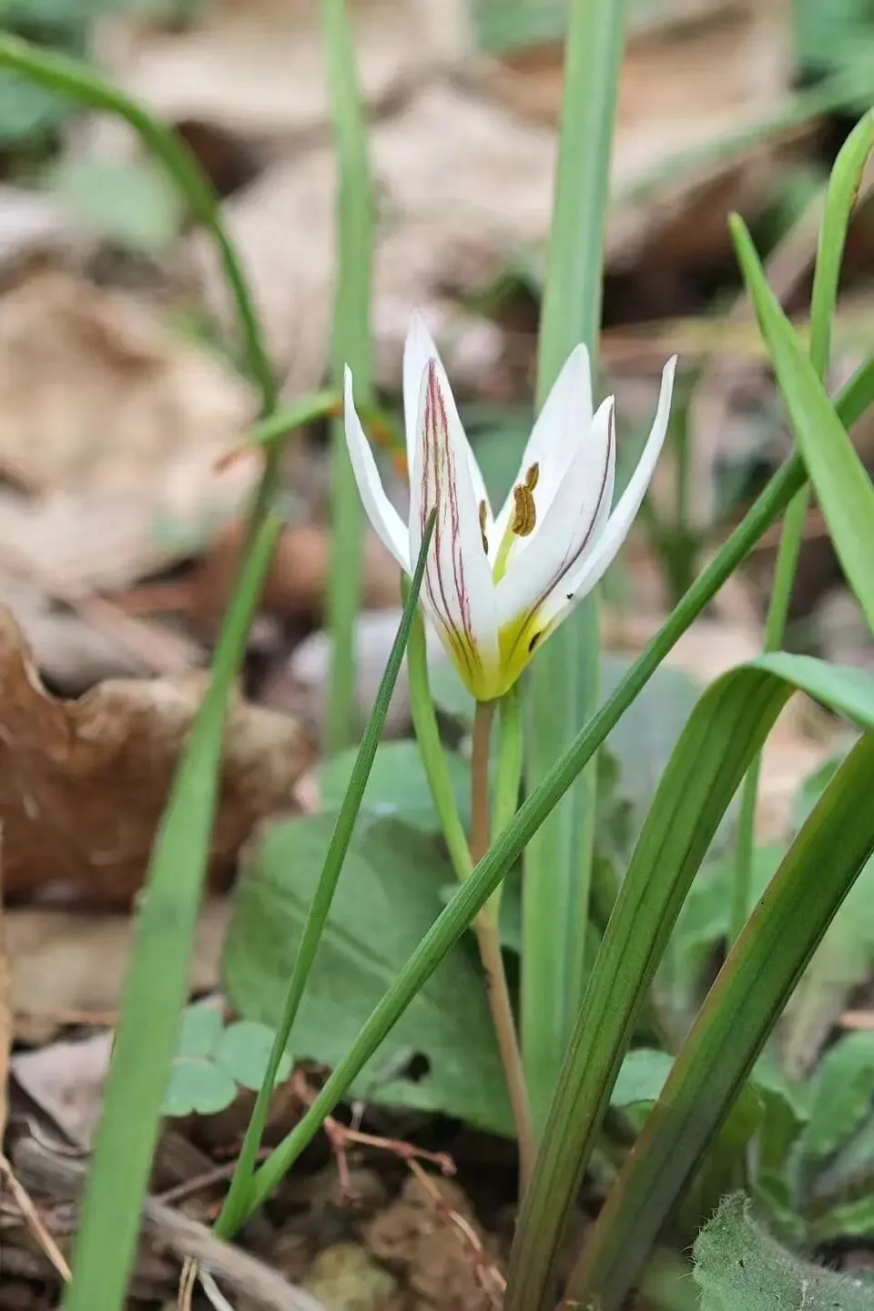 老鸦瓣是一种东亚特有的植物,白色星状的花朵背面搭配了紫红色的条纹,花心那抹鹅黄是招揽传粉昆虫的“蜜导”在紫外光下更加显著。