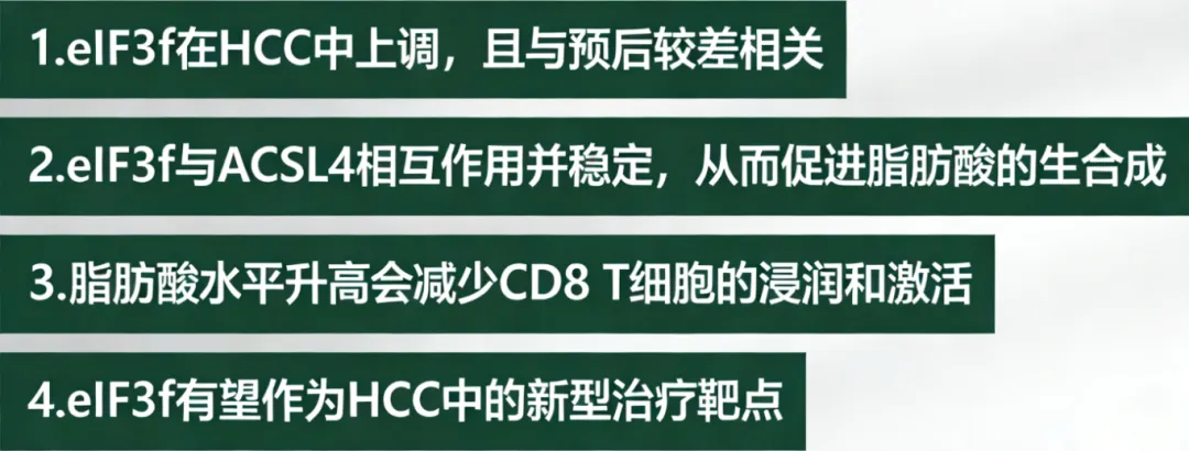 ⭐ 综上,本研究揭示 eIF3f 通过稳定 ACSL4 促进肝癌脂肪酸合成,还抑制 CD8⁺T 细胞浸润。靶向这一轴可延缓肿瘤进展,联合抗 PD-1 疗效更佳,为肝癌精准治疗提供新方向与潜在靶点。