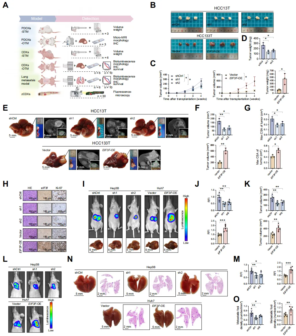 体内实验:多物种模型(小鼠、斑马鱼)中,eIF3f 敲低抑制肿瘤生长和肺转移、延长生存期,过表达则相反。