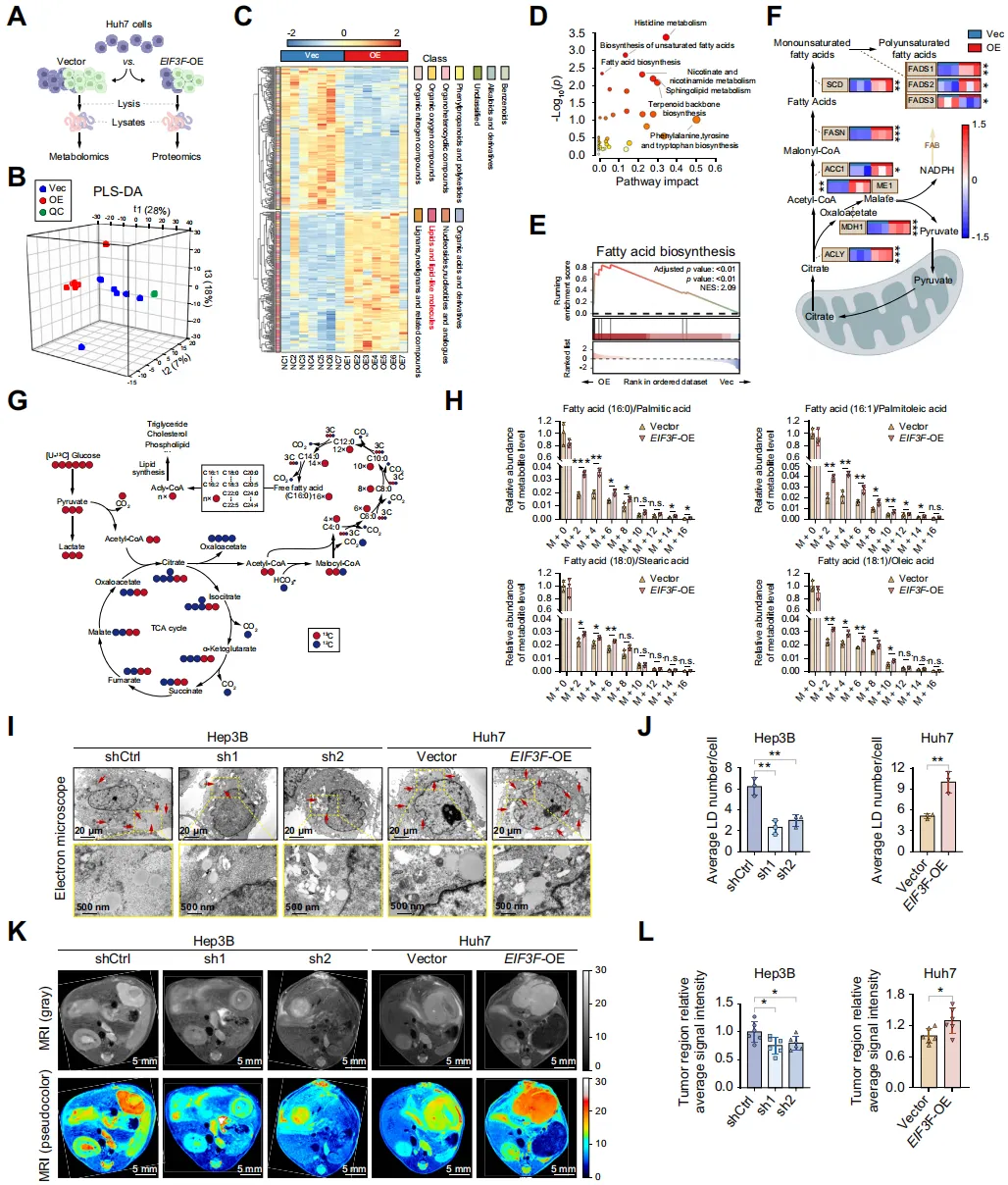 多组学分析显示,eIF3f 过表达组脂质代谢物富集,脂肪酸合成(FAB)通路显著激活;