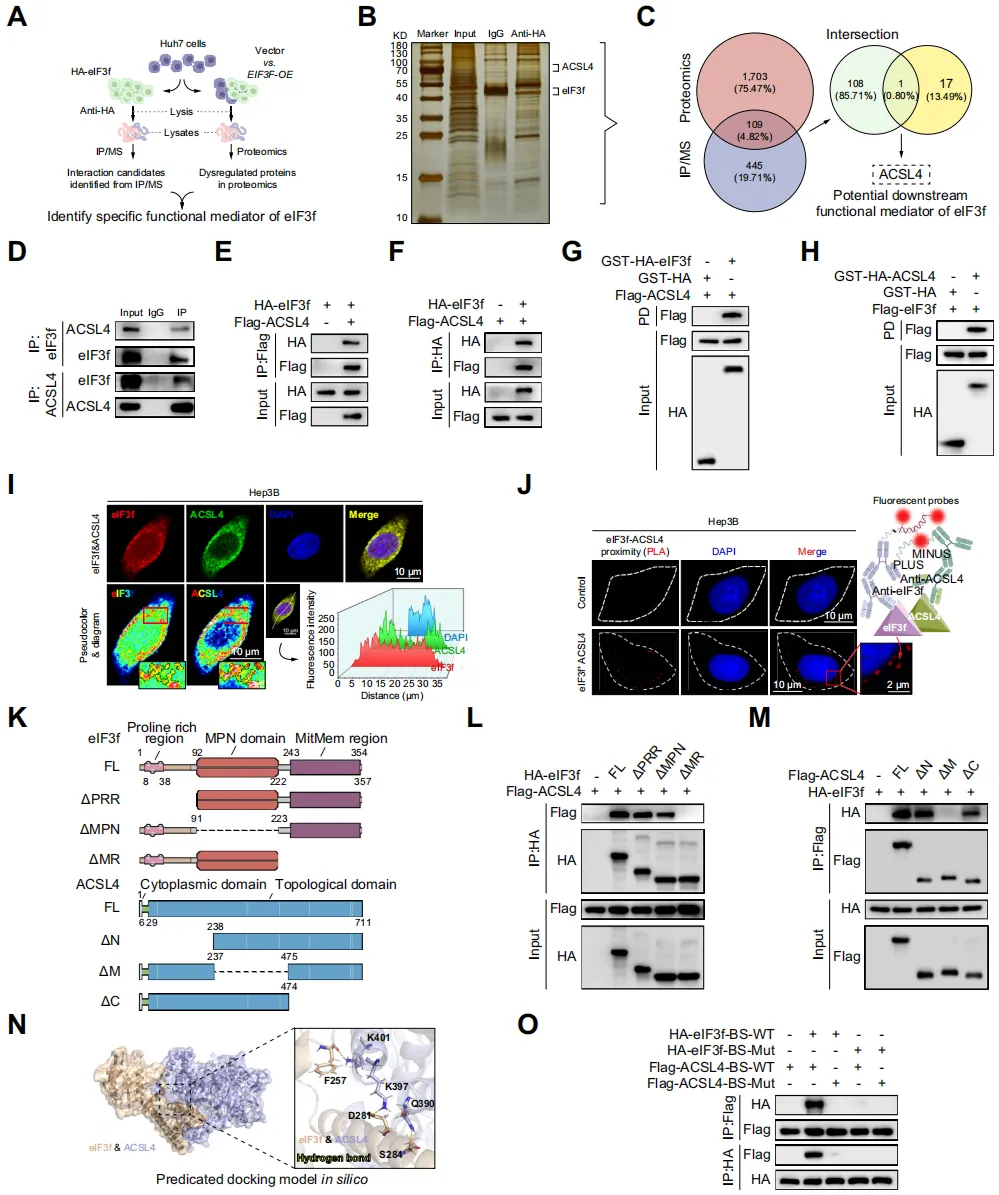 IP-MS、Co-IP 等实验证实,eIF3f 与 ACSL4 直接结合,结合区域分别为 eIF3f 的 MitMem 区(223-357 位氨基酸)和 ACSL4 的中央区(238-474 位氨基酸);