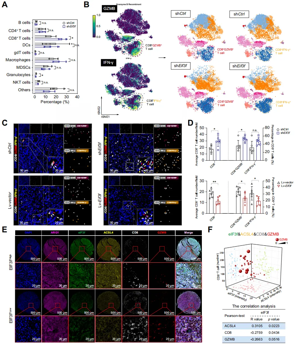 临床样本分析显示,eIF3f 表达与 ACSL4 正相关,与 CD8⁺T 细胞数量、GZMB 水平负相关。