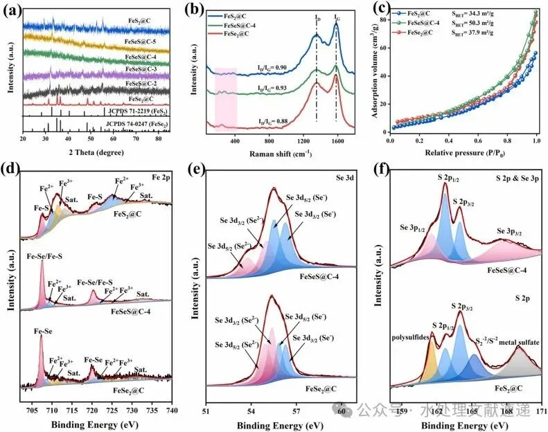 Fig. 2. (a) XRD patterns, (b) Raman spectra, (c) N2 adsorption/desorption isotherms, and high-resolution XPS spectra of the as-synthesized catalysts (d) Fe 2p, (e) Se 3d, and (f) S 2p&Se 3p.