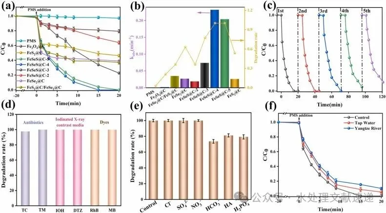 Fig. 3. (a) DTZ degradation in various systems and (b) corresponding first-order kinetic analysis and degradation rate results, (c) recycling properties of FeSeS@C-4/PMS system for DTZ degradation, (d) degradation of multiple pollutants by FeSeS@C-4, (e) influences of different ions on DTZ degradation, (f) DTZ degradation rate in different natural waters in FeSeS@C-4/PMS system. Reaction conditions: [catalyst]0 = 0.2 g/L, [PMS]0 = 1.5 mM, [DTZ]0 = 30.0 mg/L, [inorganic ions]0 = 10 mM, [HA]0 = 10 mg/L.