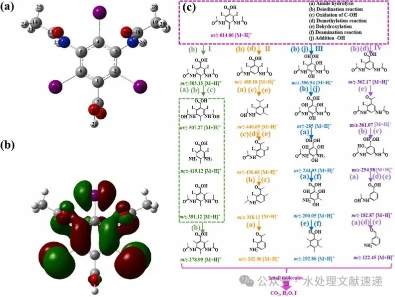 Fig. 4. (a) The optimized molecule structure of DTZ, (b) HOMO of DTZ, and (c) degradation pathways of DTZ in FeSeS@C-4/PMS system.