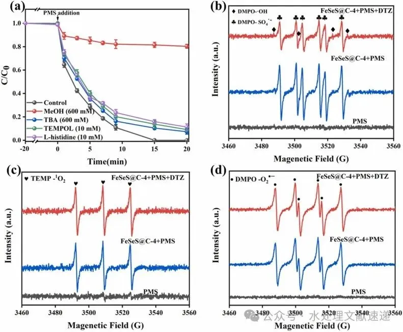 Fig. 5. (a) Effects of various quenchers on DTZ degradation in FeSeS@C-4/PMS system, and (b-d) EPR spectra in different reaction systems. Reaction conditions: ([DTZ]0=30 mg/L, [PMS]0=1.5 mM, [catalyst]0= 0.2 g/L).
