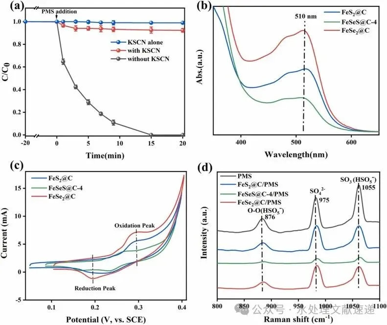 Fig. 6. (a) KSCN poisoning experiment, (b) UV–vis spectra of FeSeS@C-4/Fe3+ suspension in the presence of phenanthroline, (c) cyclic voltammetry (CV) curves, (d) Raman spectra of various reaction systems.