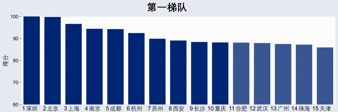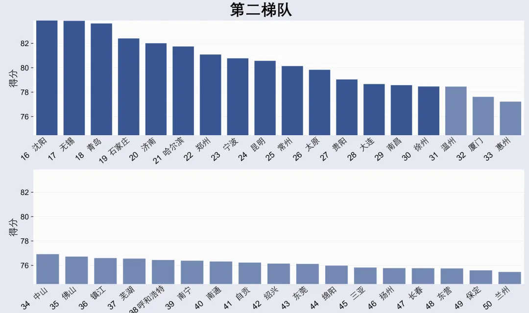 长三角城市群整体优势最为突出,在城市数量、梯队完整性和功能层级上均表现出显著领先。第一梯队中,上海(第3位)、南京(第4位)、杭州(第6位)、苏州(第7位)、合肥(第11位)多城进入,形成多核心并行的高能级结构;第二梯队中,无锡、宁波、温州、常州、徐州、绍兴、南通、芜湖、镇江等城市密集分布,对第一梯队核心城市形成稳定的纵深支撑和外延拓展,体现出长三角在产业承接、应用场景扩展和要素扩散方面的系统性优势。