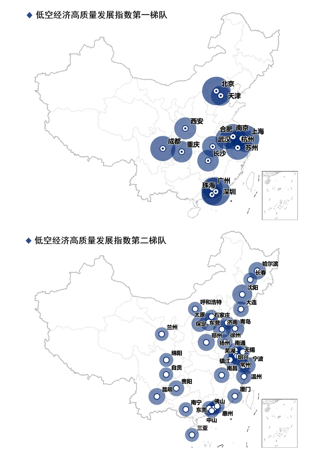 第一梯队中除核心引领城市外,南京、成都、杭州、苏州、西安、长沙、重庆、广州等城市构成低空经济发展的第二层核心力量,但其优势来源和发展路径呈现出明显差异。
