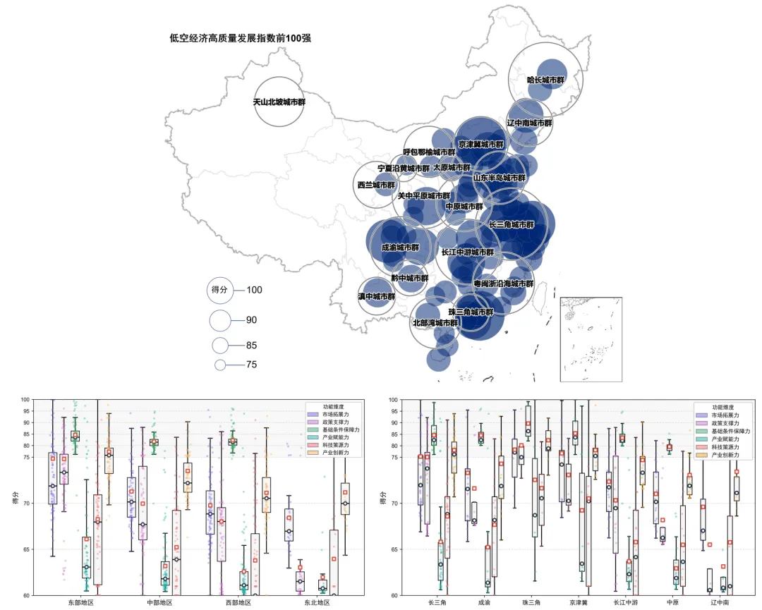 此外,从功能分工看,不同城市群在低空经济发展中呈现出差异化定位。长三角更强调创新-产业-市场的系统协同,大湾区突出制造能力与应用落地,京津冀侧重高端创新策源与制度引领,而长江中游和成渝地区则更多承担区域扩散和跨区域承接功能。这种差异化分工,使城市群不仅是低空经济集聚的空间载体,也是多路径并进、结构特征分化的重要组织单元。