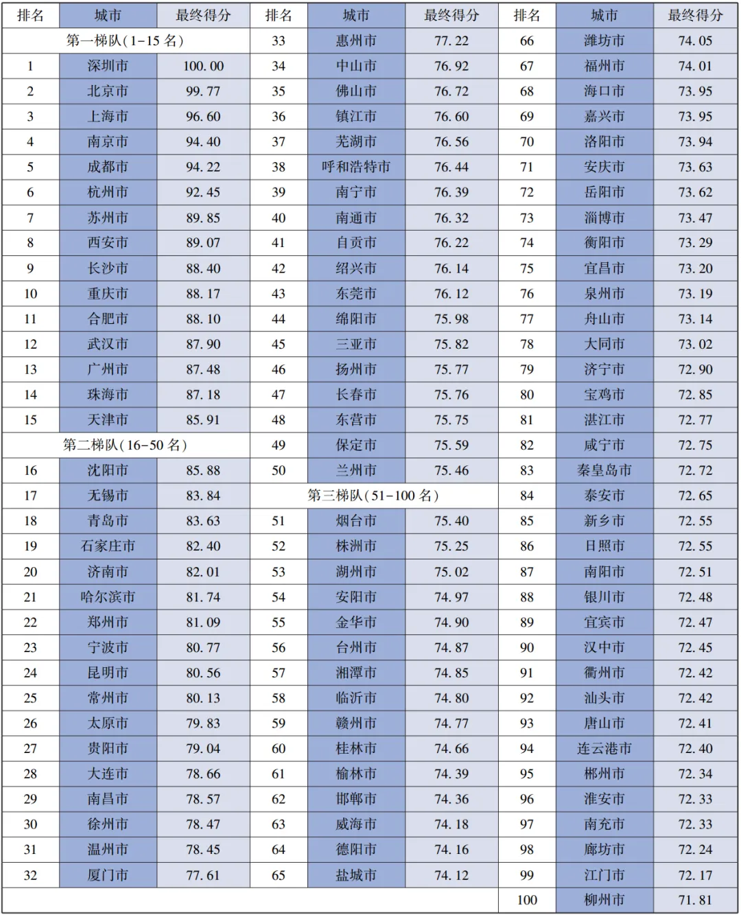 深圳综合得分为100分,位居全国首位,在产业赋能力、产业创新力和政策支撑力等维度均排名全国第一,系统性优势突出。深圳持续完善通用机场、低空起降点和数字化运行管控系统等基础设施布局,并在全国率先出台低空经济专项法规,推进智能融合低空系统建设,有效提升了低空应用的制度可实施性和场景可复制性,构成其保持综合领先地位的重要支撑。