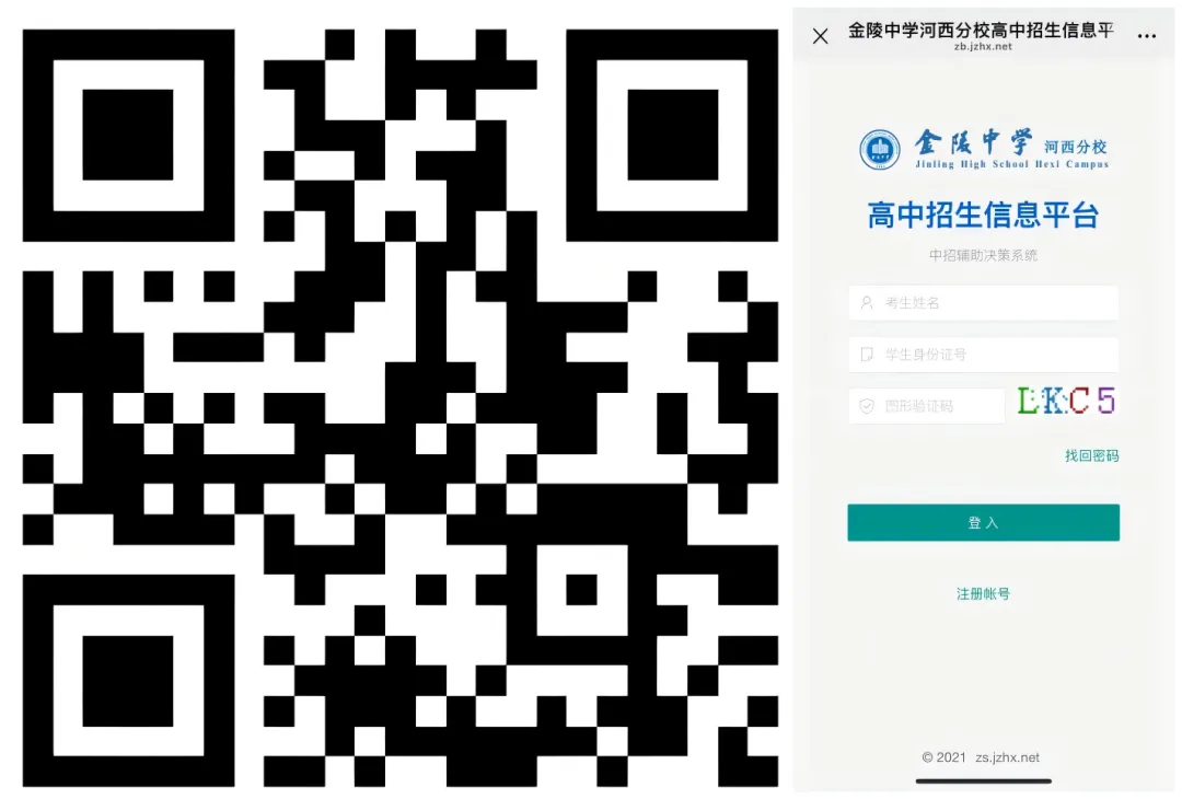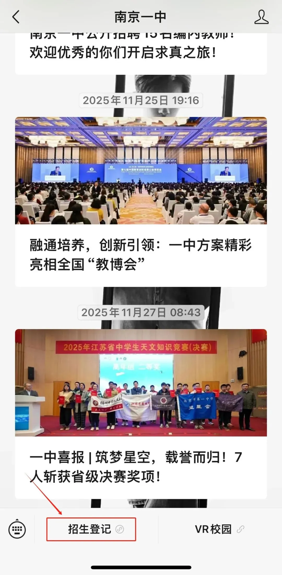 1. 微信打开【雨花台中学】公众号 2. 点击信息界面—【招生登记】