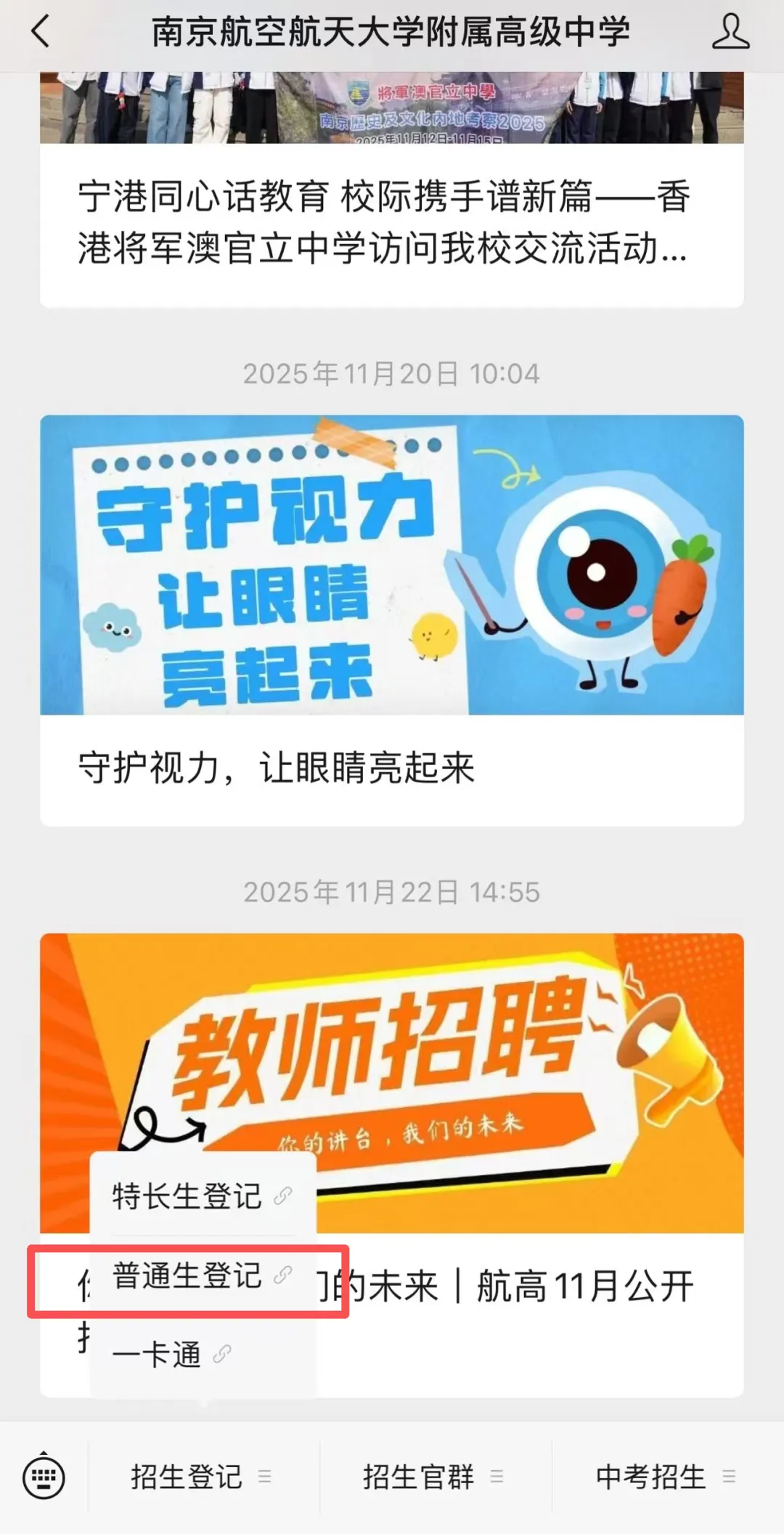 1. 微信打开【南京航空航天大学附属高级中学】公众号 2. 点击信息界面—【招生登记】—【普通生登记】