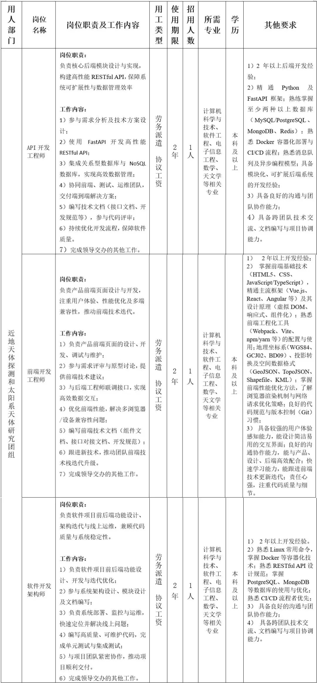 1)应招人员个人简历(附件表)“应招岗位”栏填报:“应招近地天体探测和太阳系天体研究团组API开发工程师”或“应招近地天体探测和太阳系天体研究团组前端开发工程师”或“应招近地天体探测和太阳系天体研究团组软件开发架构师”。