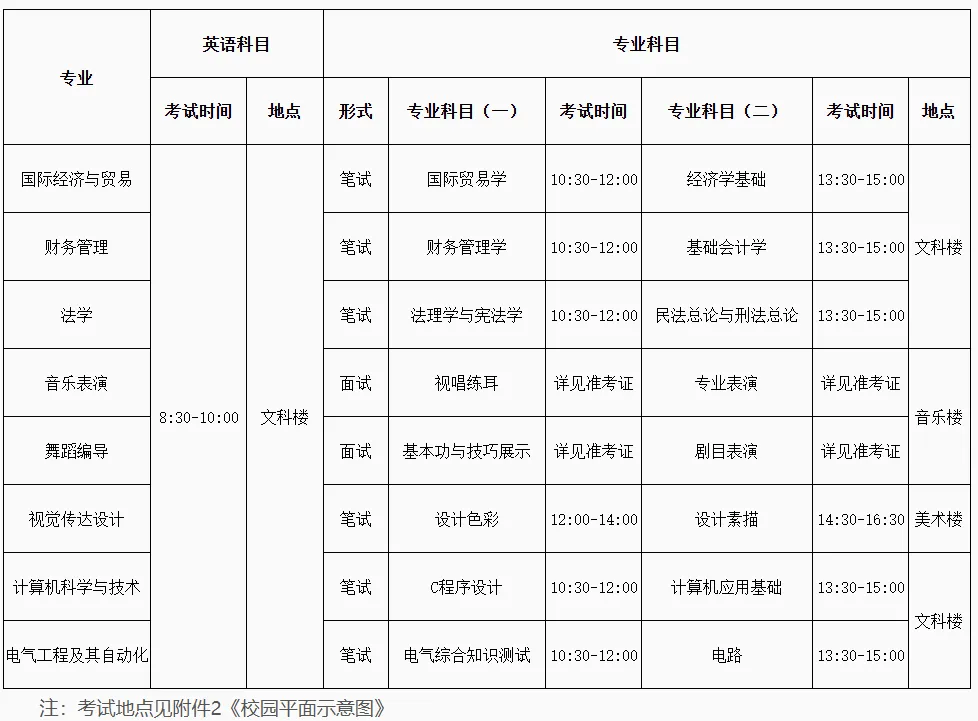 各专业考试科目安排如下表,具体考场安排见准考证。