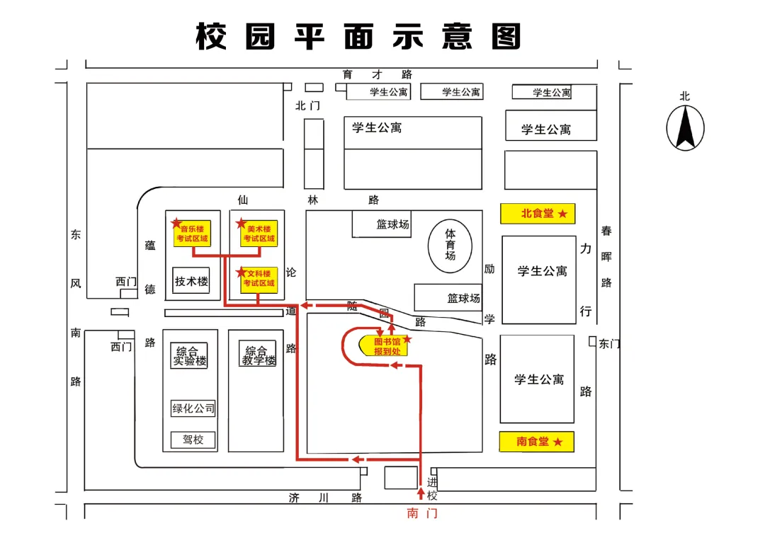 1.考生报到当天凭本人身份证和学生证(或学校证明)进校,考试当天凭准考证进校,考生一律从学校南门(济川东路96号)进校,并配合接受入校检查。送考车辆不得进入校园,请考生务必提前安排好行程,以免耽误考试。