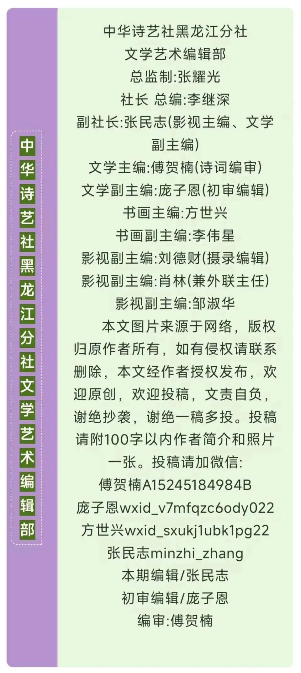 1、原创格律诗词(韵律自检)、现代诗(20行以内)、散文诗、诗论来稿。每次投稿,需附百字以内作者简介、清晰生活照一张。