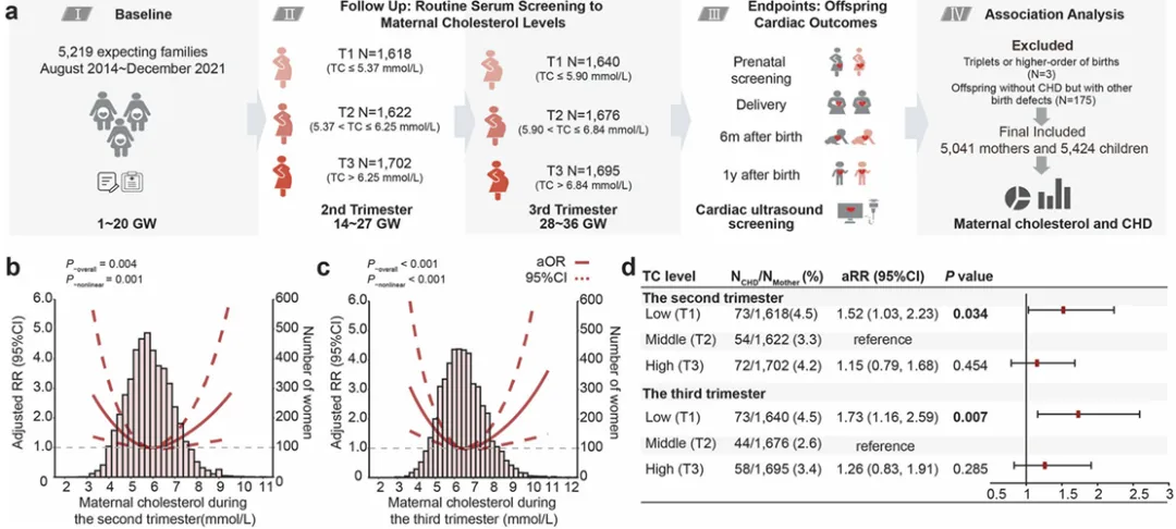 依托5041对母子的出生队列,分析孕期胆固醇水平与胎儿心脏发育的关系,首次发现母体胆固醇过低与子代先心病风险显著相关。