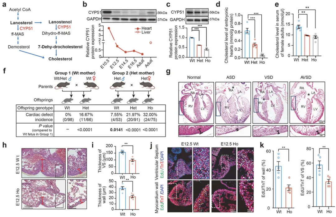 E12.5心脏组织中的胆固醇水平在携带突变Cyp51等位基因的杂合小鼠中降低,而在纯合突变体中几乎检测不到(图3d)。此外,携带突变Cyp51等位基因的成年雌性小鼠血清胆固醇水平也下降(图3e)。