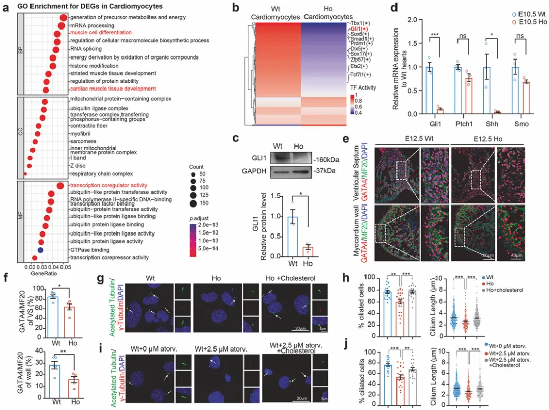 为了进一步探索这些发现,我们使用SCENIC分析心肌细胞中的转录因子活性,并观察到突变心肌细胞中Hedgehog信号通路的关键效应因子GLI1的活性显著下降(图4b)。
