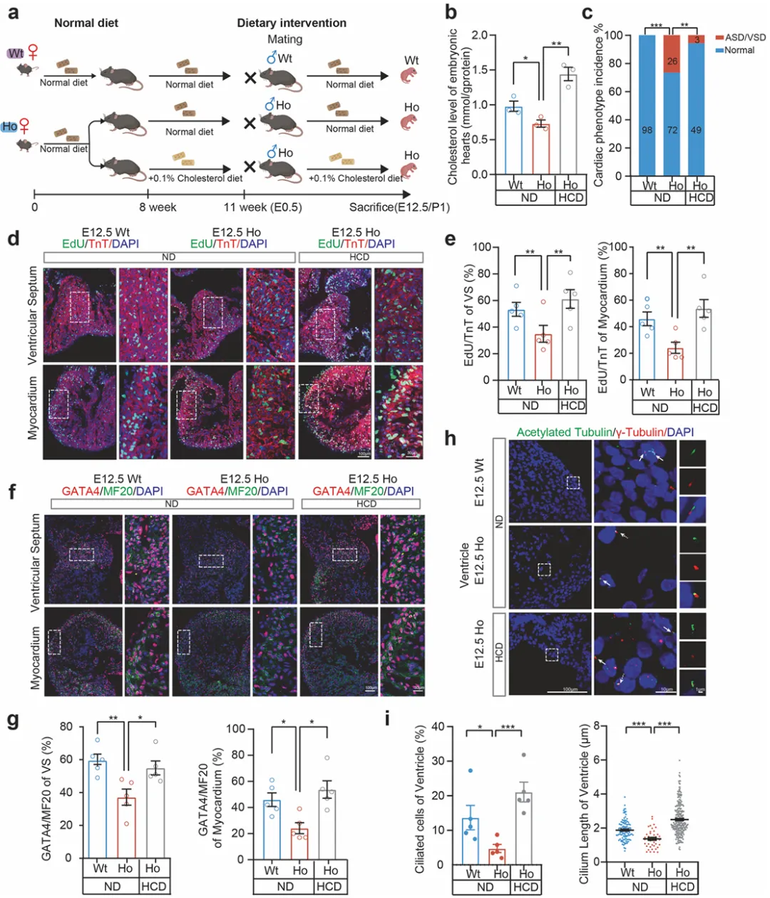 经过三周的治疗后,将野生型C57BL/6J两细胞胚胎移植到处理组和对照组的ICR雌性小鼠体内。在妊娠第12.5天,母体胆固醇的降低显著降低了胚胎心脏胆固醇水平,这与母体血清胆固醇的变化相呼应(图2f)。