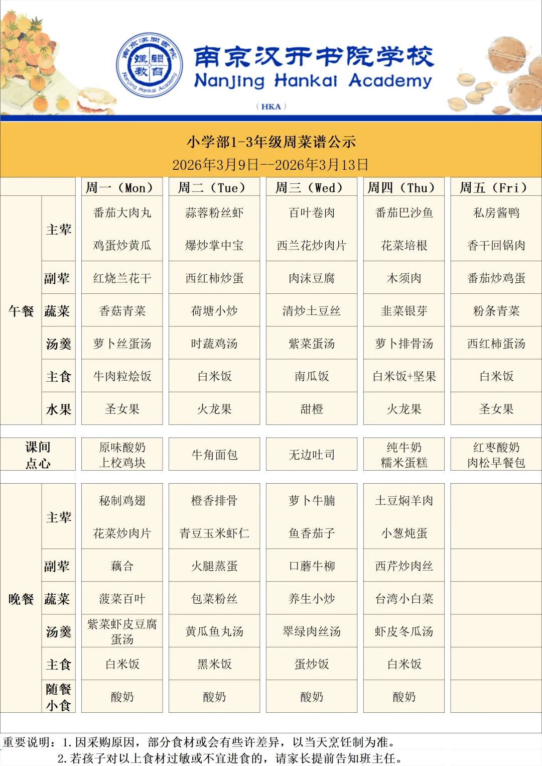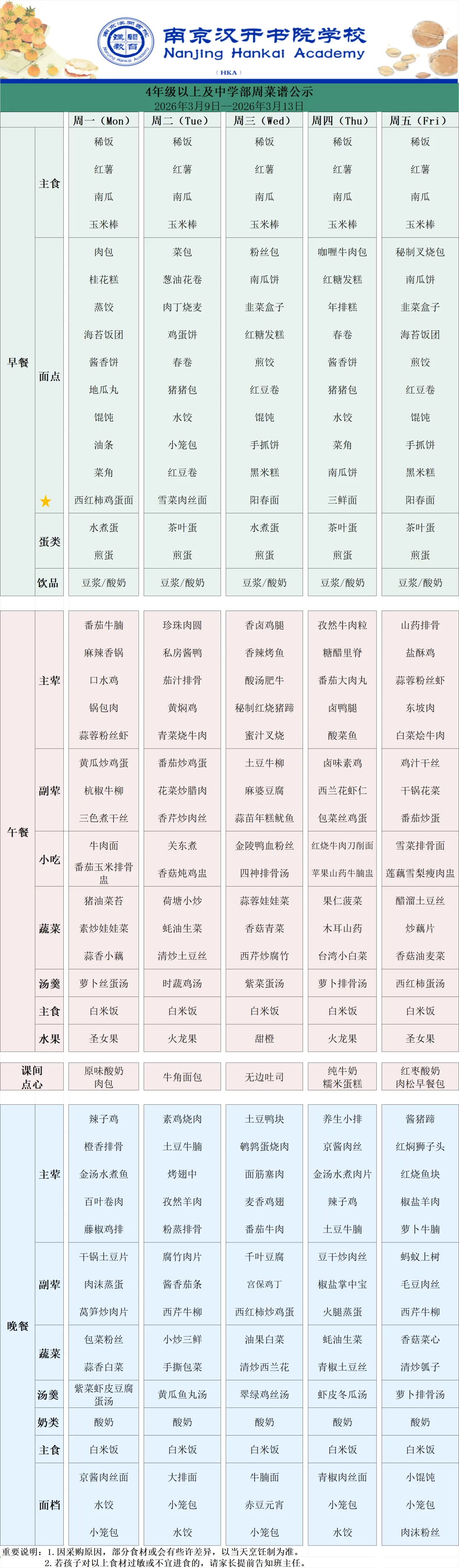 【Hi,开开!】南京汉开书院高中部周菜谱(3.9-3.13)