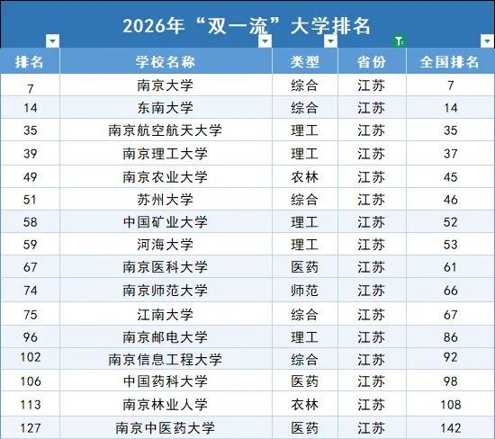 南京优势更巩固:全省 16 所双一流高校中,南京独占 13 所,前 10 名中南京高校占据 9 席,省会的资源集聚效应依然显著。