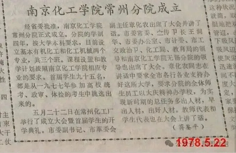 一、初创(1978年,无锡、常州两地同时建校)。1978年3月:江苏省委决定成立南京化工学院无锡分院,校址先在无锡锡惠公园忍草庵 。这个决定作出之后,常州一直很拼,认为自个在传统工业特别是化工行业这一块不比无锡差,所以当时是一直在向省上争取,终于,1978年4月省上决定:同时成立南京化工学院常州分院,校址在常州化工厂内 。