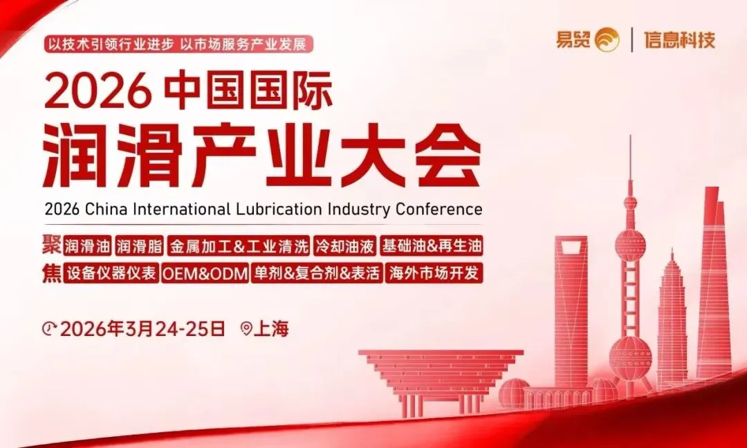 2026年3月24-25日,易贸将在上海召开“2026中国国际润滑产业大会——聚焦润滑油、润滑脂、金属加工&工业清洗、冷却油液、基础油&再生油、设备仪器仪表、OEM&ODM、单剂&复合剂&表活、海外市场开发”,行业盛会正在火热报名中详询15953586562。