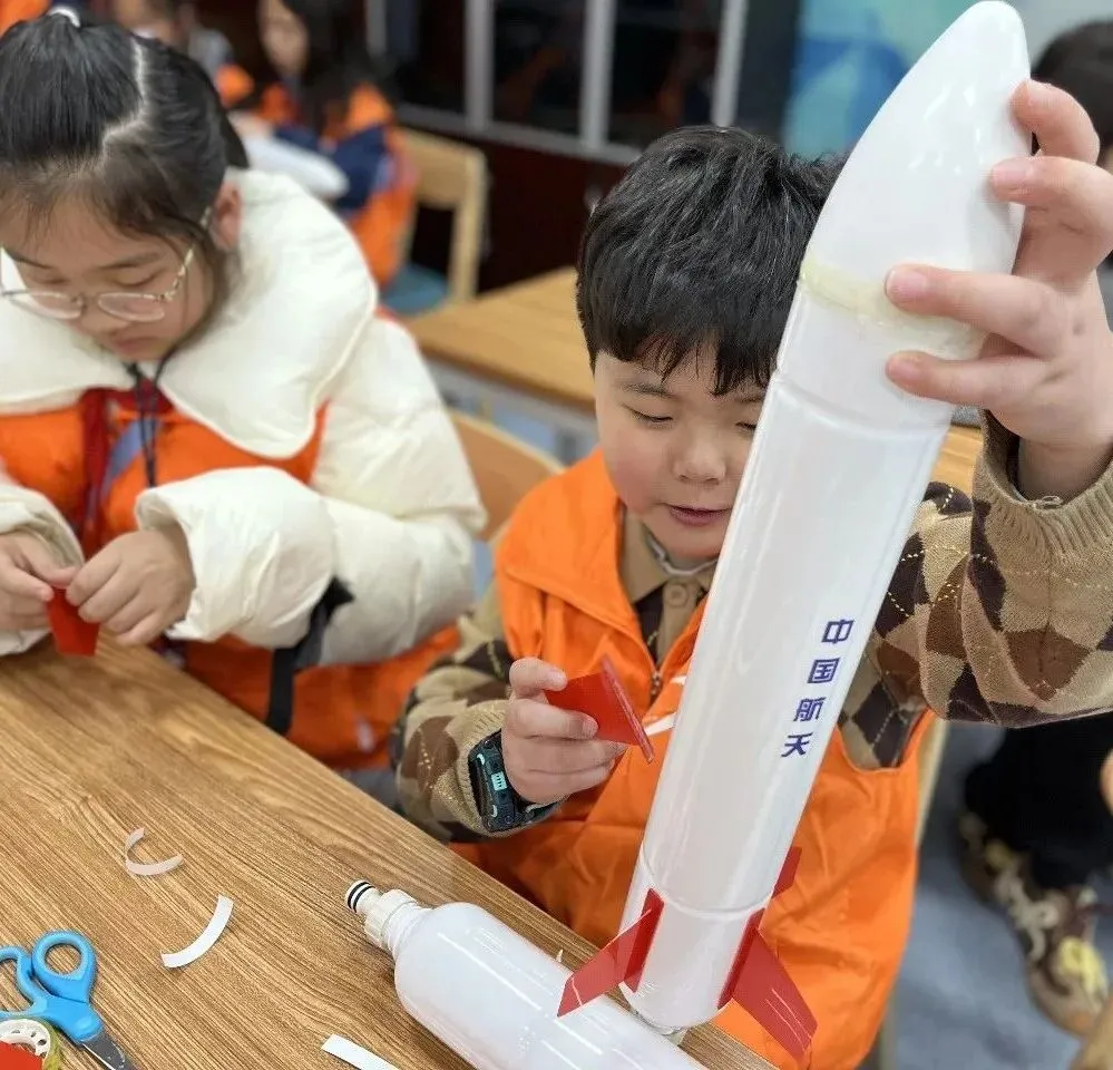 在“寻访伟大成就”线路中,队员们走进一楼少儿科普体验展区,近距离探访潜艇、“蛟龙”号、长征2F火箭等大国重器模型,还亲手操作大型竹蜻蜓,直观感受空气动力学的奥秘。结合《一飞冲天》互动课程,辅导员用通俗易懂的语言,为孩子们拆解反冲推力、浮力与压强等科学原理,通过趣味实验,让大家真切体会到中国在航天、深潜领域取得的辉煌成就,感受背后的科技硬实力。