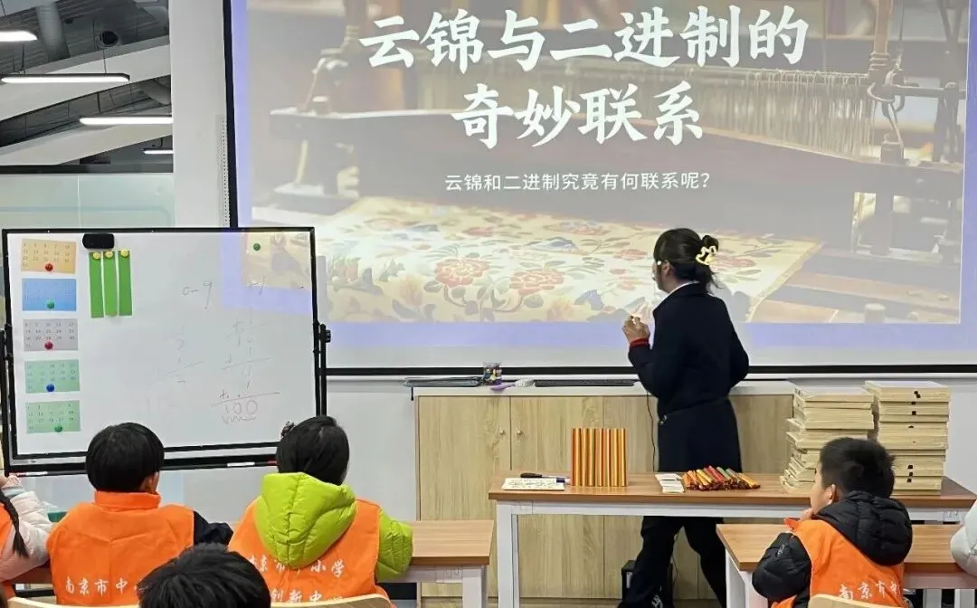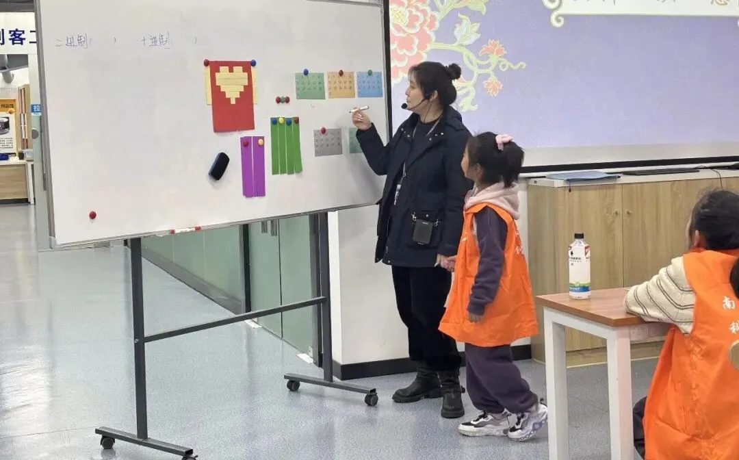 在“寻访非遗里的科技”路线中,活动以聚焦二进制知识普及为核心,队员们走进二楼信息技术展区,探访“科技律动”“翻转之间”等特色展品,在趣味互动中开启非遗与科技结合的探索之旅。辅导员将南京云锦“挑花结本”工艺与二进制编码巧妙结合,为孩子们讲解古老技艺中蕴藏的科学智慧,让大家惊叹于传统文化与现代科技的相同之美。在三楼创客工坊的实践环节,孩子们将所学知识灵活运用,动手实践、大胆尝试,真正做到知行合一,在探索中找到非遗文化里的科学密码。