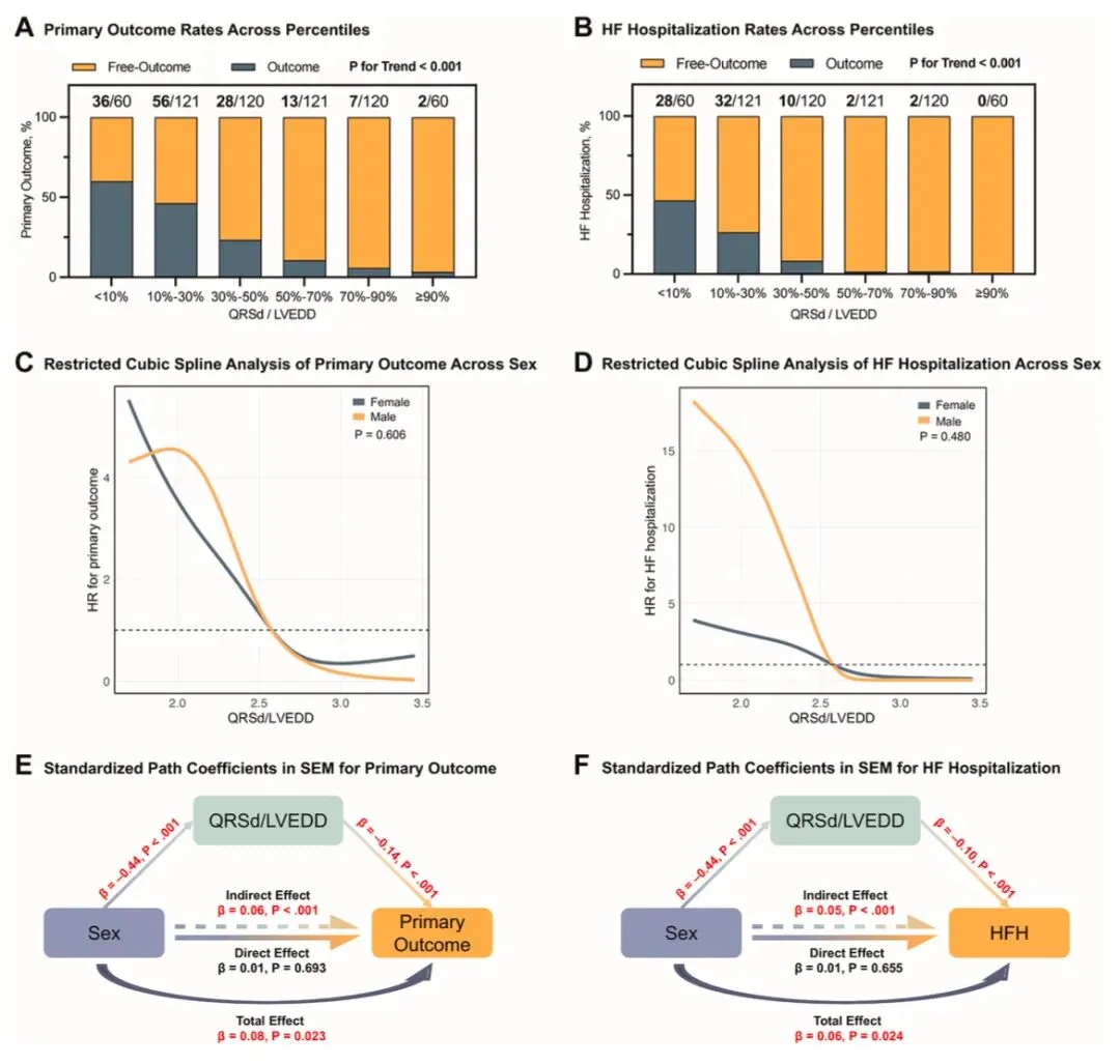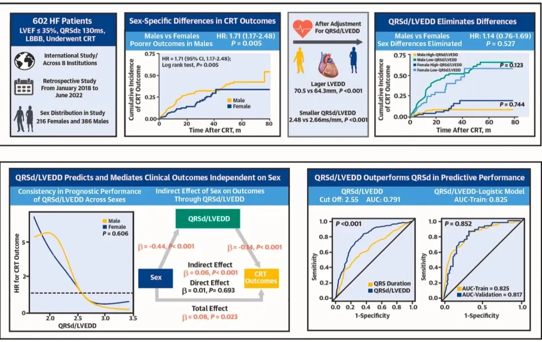 本多中心回顾性研究纳入602例接受CRT的患者,提取QRSd与LVEDD计算比值,采用Cox回归、ROC曲线、结构方程模型等,分析其对复合终点的预测价值及性别差异介导机制。