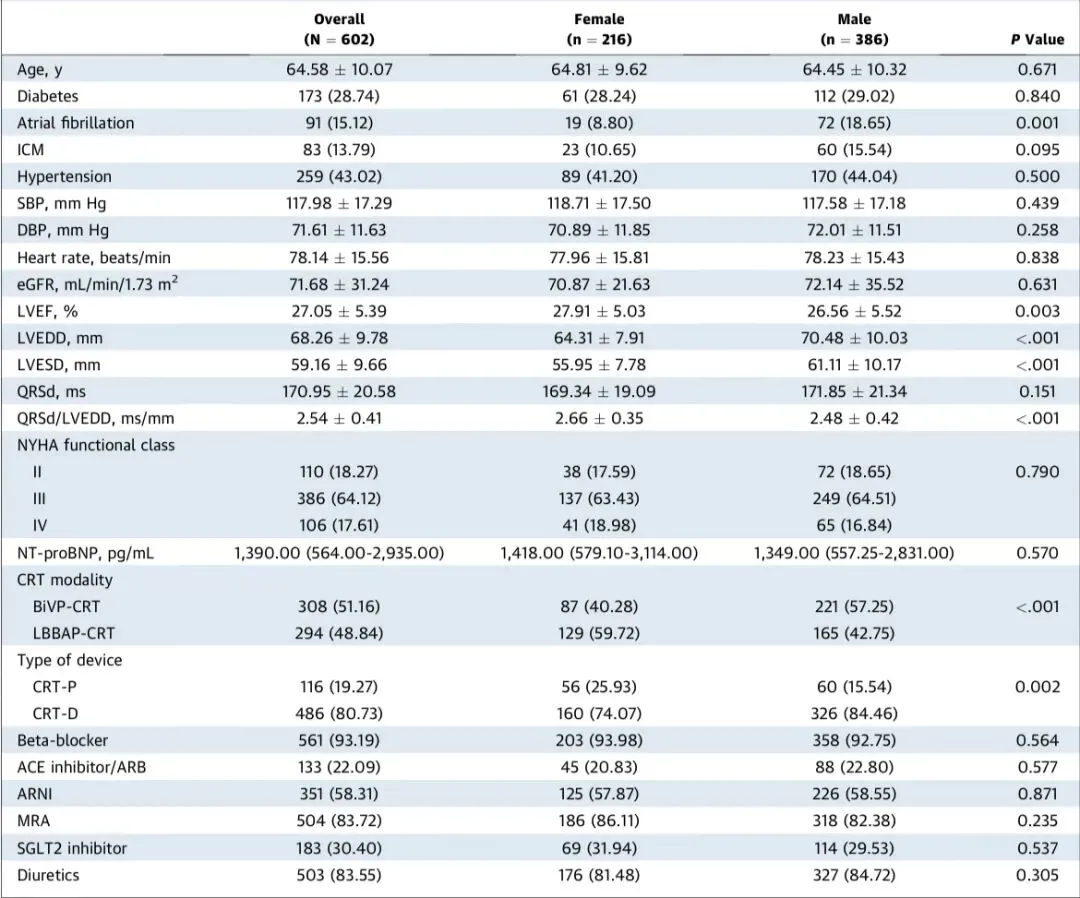 女性患者心脏更小,QRSd/LVEDD比值更高,LVEF更高,房颤比例更低,LBBAP比例更高。