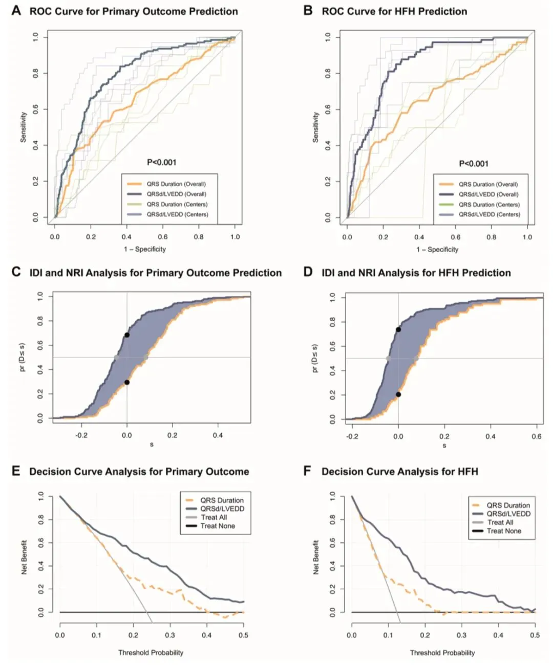 QRSd/LVEDD预测主要终点的AUC显著高于QRSd,预测心衰住院AUC也更高,临床净获益更高。
