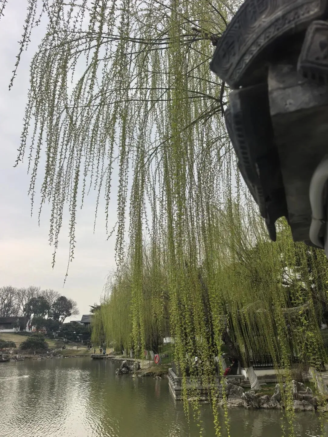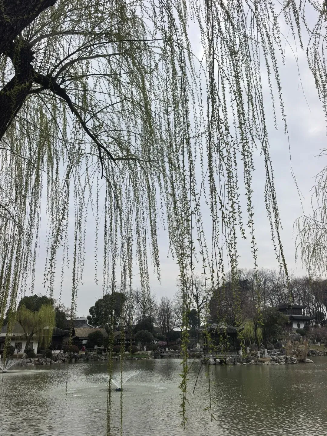 愚园,最主要是喜欢看湖西侧的杨柳树。初春,杨柳刚刚发芽,嫩绿的、长长的、纤细的柳枝随风摇摆,体态婀娜。进入夏季,杨柳生长,柳枝可触及湖面。垂柳的绿可保持到深秋,一年中三季均可观赏。