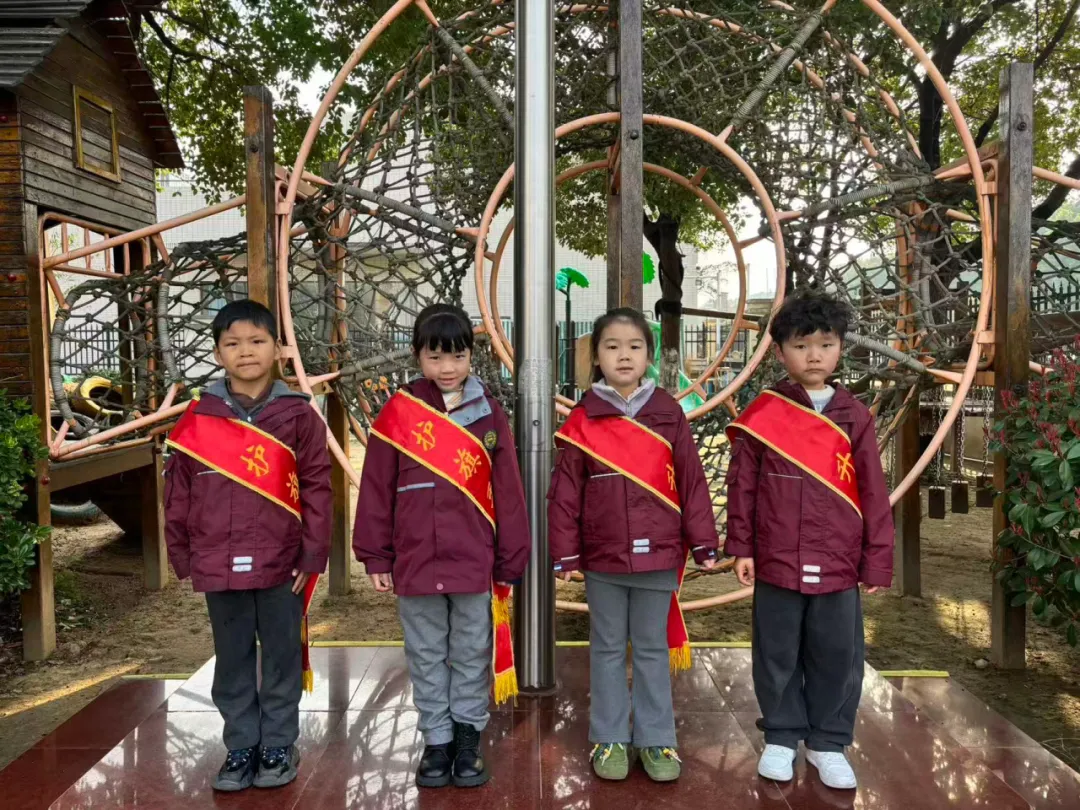 本周,大三班的小朋友荣幸担任升护旗手!瞧,四名小旗手身着整齐的衣服,组成庄严的国旗护卫队,在雄壮的鼓号声中,迈着铿锵有力的步伐稳步向前,眼神坚定又自豪,每一步都透着满满的庄重感。