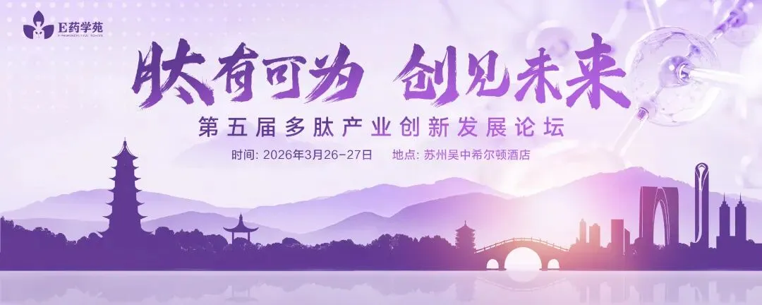 由E药学苑主办的第五届多肽产业创新发展论坛将于2026年3月26-27日在苏州召开,本届论坛将汇集100+大咖演讲,40+主流展商,1000+专业人士,聚焦多肽减肥药、吸入多肽制剂,口服多肽等热门领域,涵盖多肽分离纯化、多肽合成及生产、多肽偶联药物等专题论坛,围绕“肽有可为,创见未来”的大会主题,继续为相关领域的专家及科研人员提供一个深度的多肽产业的思想碰撞及经验分享平台。