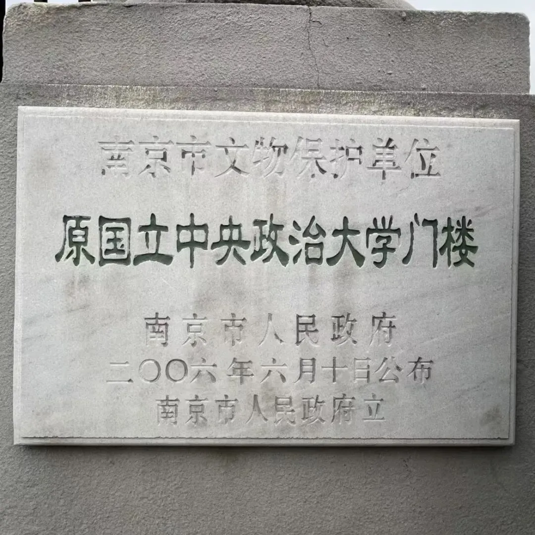 在门楼基座上,嵌着南京市文物保护单位的石牌,下书“原国立中央政治大学门楼”。