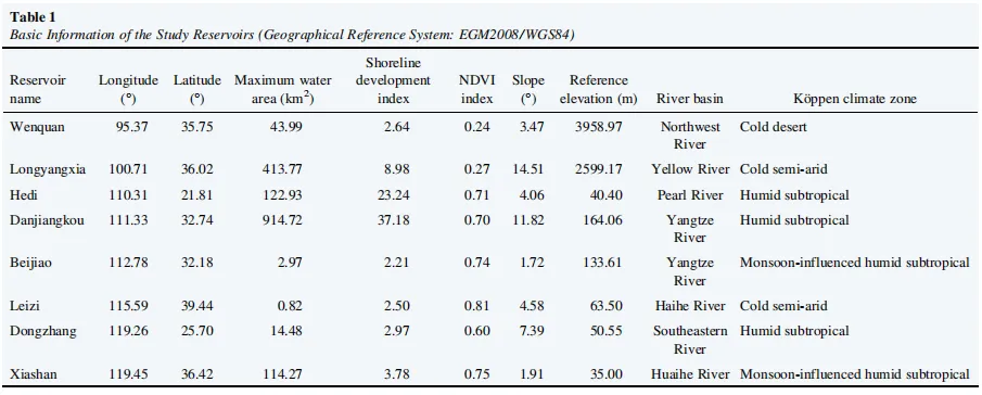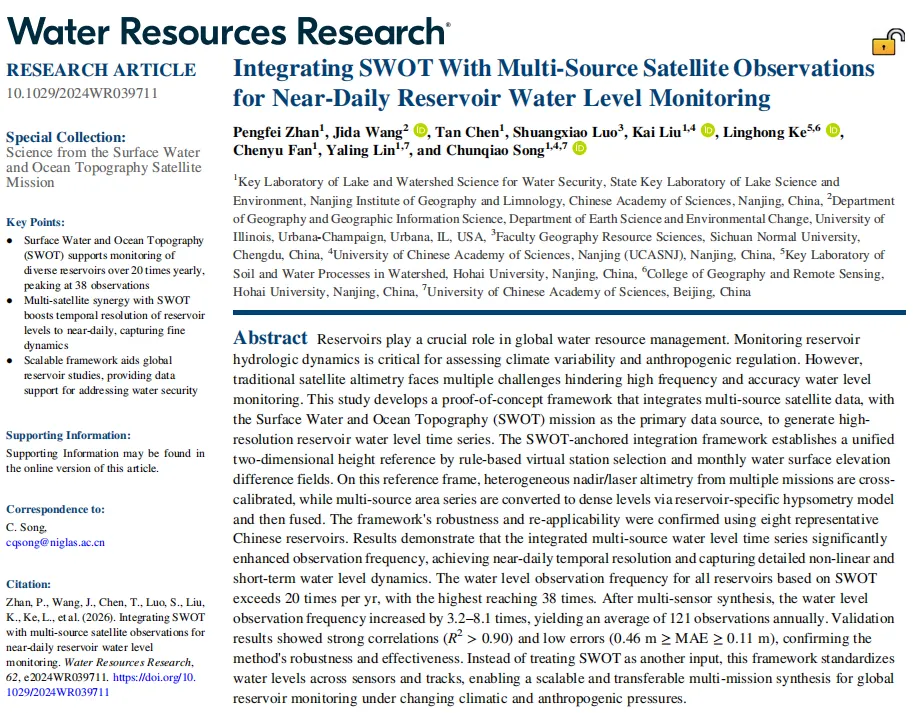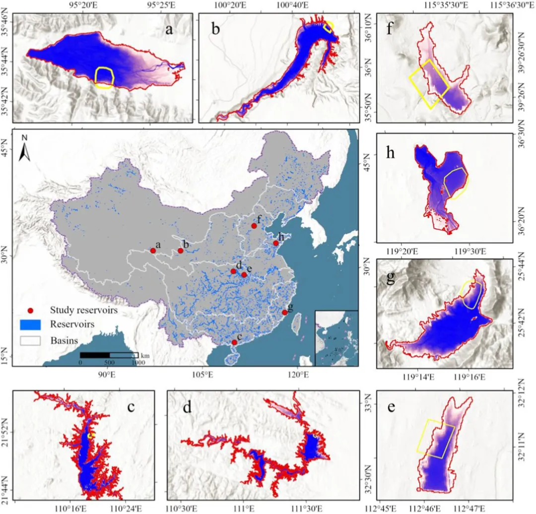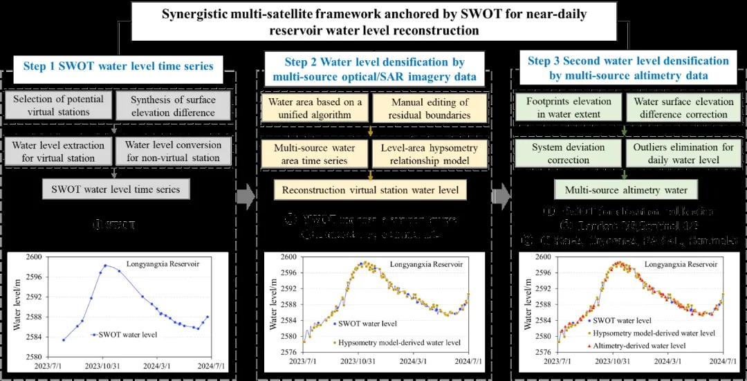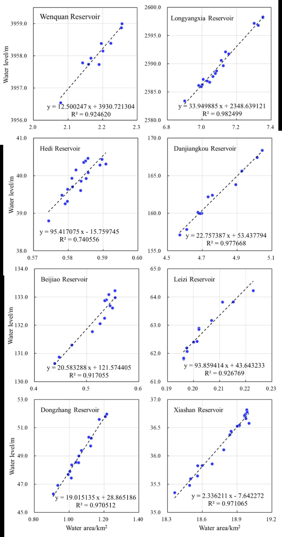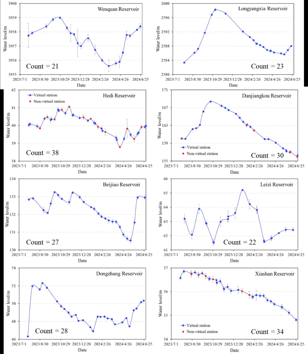 多源影像提取的水面面积与SWOT水位建立的测高模型关系密切(大多数水库R² > 0.90)。应用此模型后,水位观测频率相比仅用SWOT提升了2-5倍。例如,雷子水库(无传统高度计覆盖)的观测次数大幅增加,证明了该方法对小型水库的有效性(图7 展示了重建后的水位时间序列)。