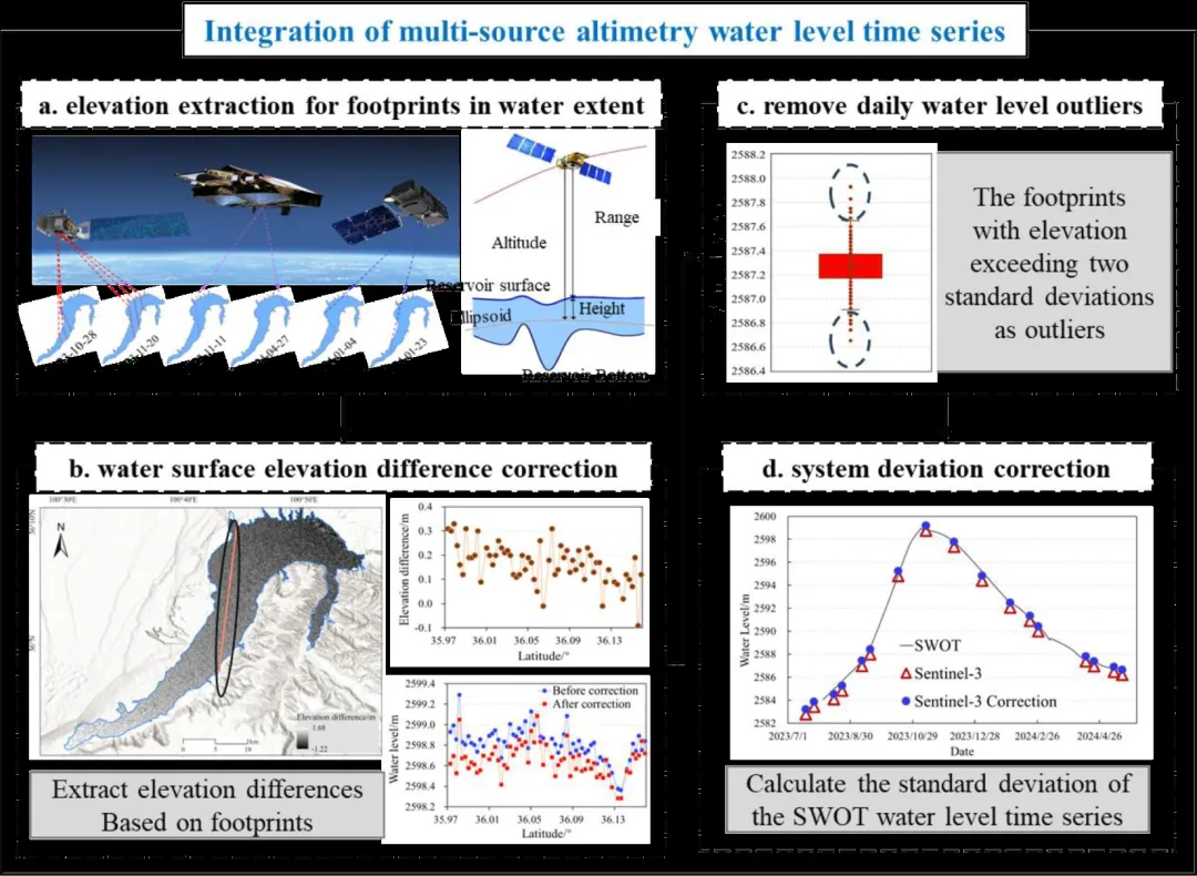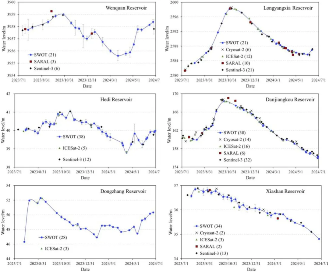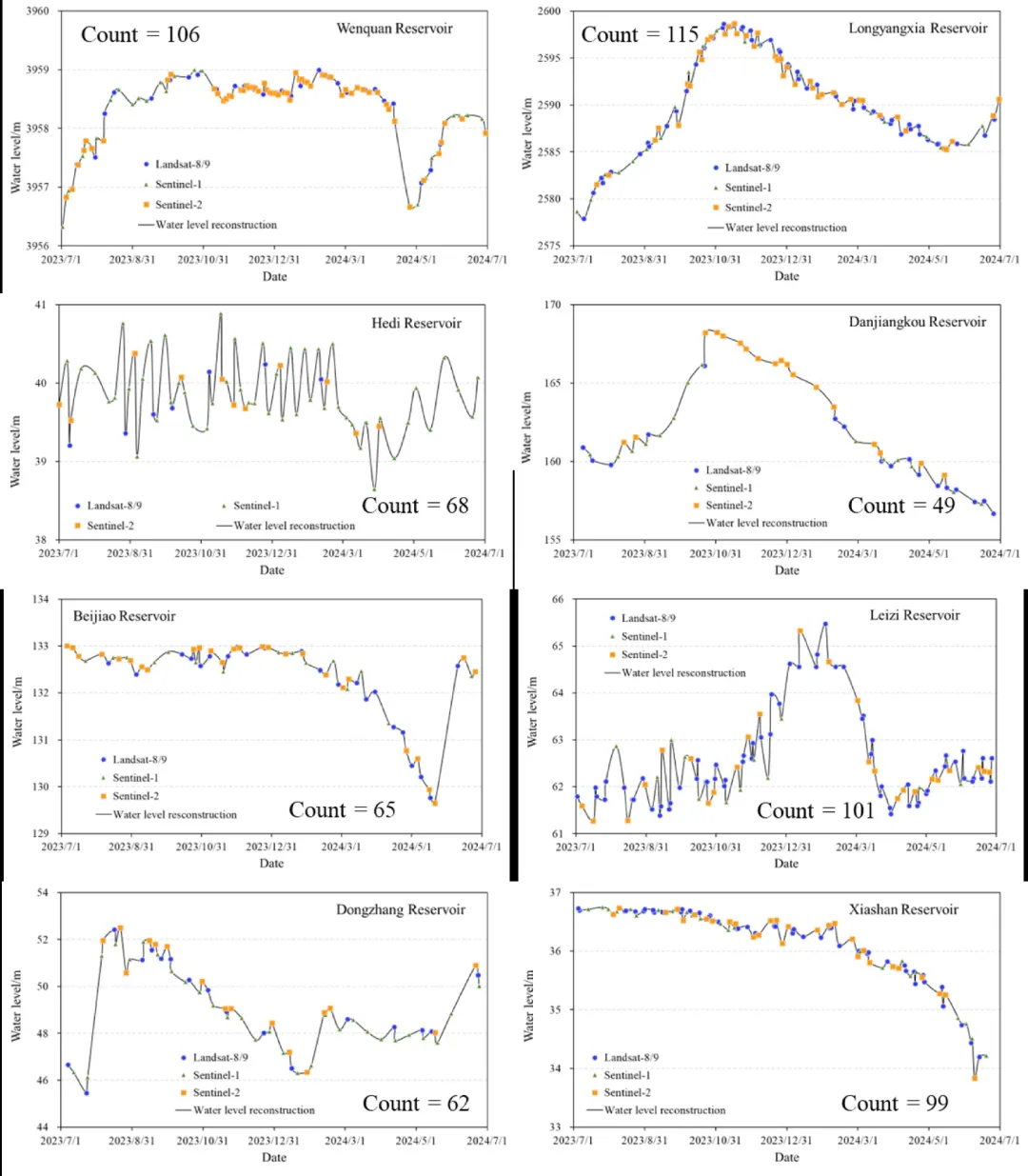 对于有传统高度计覆盖的大型水库(如龙羊峡、丹江口),集成多源高度计数据可进一步增加观测点。其中,Sentinel-3提供的观测次数最多,ICESat-2精度最高。此步骤为丹江口水库额外增加了68个水位观测值,使其观测频率提升了86%(图8 展示了多源高度计数据的补充效果)。