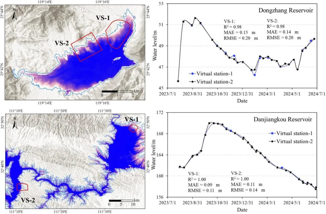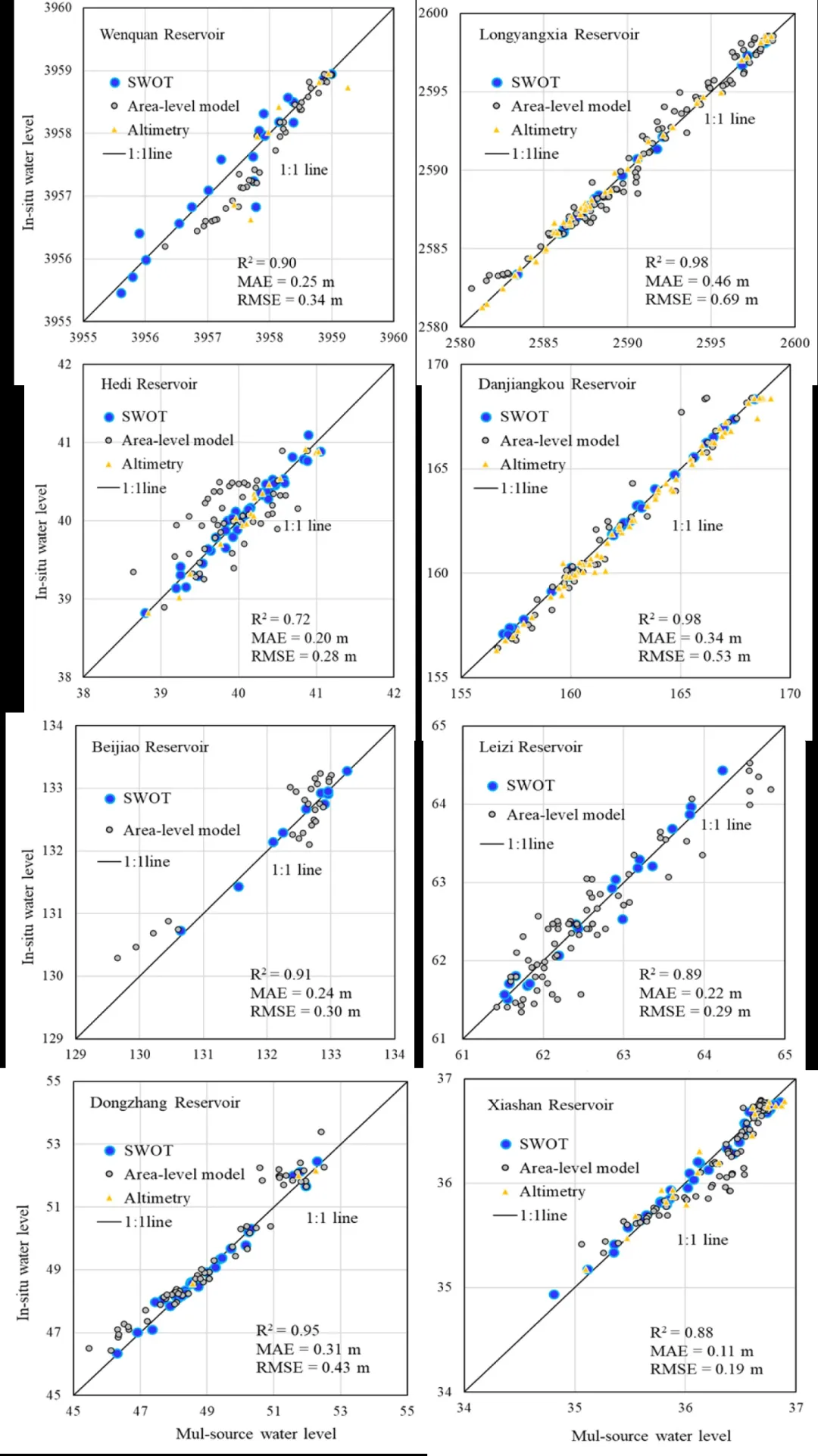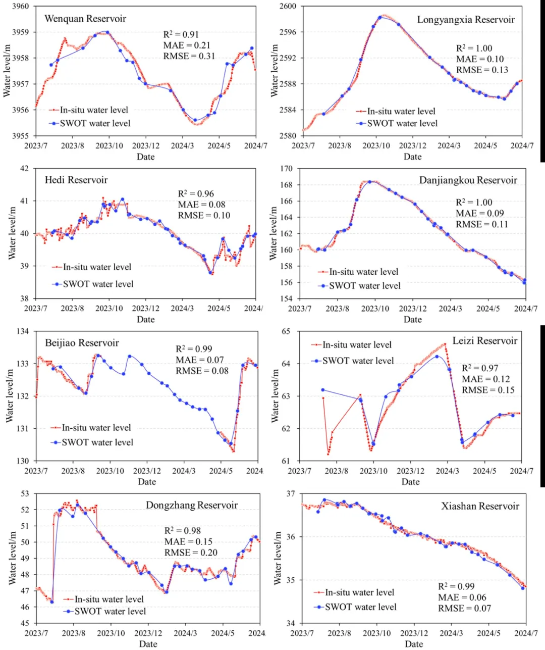 。SWOT反演水位与原位数据对比显示出高精度(R² > 0.90,平均绝对误差MAE在0.08至0.21米之间),验证了其作为基准数据的可靠性(图5 展示了四个水库的验证结果)。