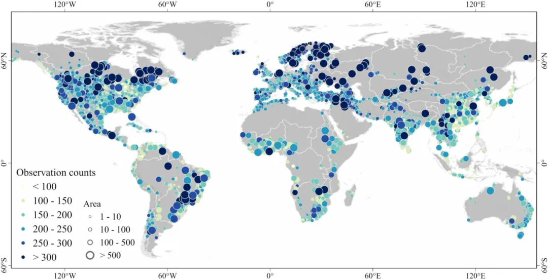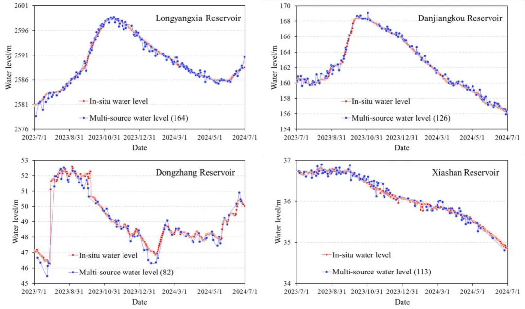 最终的多源合成水位时间序列实现了近每日的观测频率。例如,龙羊峡水库的年观测次数从仅SWOT的23次增至164次,平均时间分辨率约2天。验证表明,合成序列能准确捕捉水位的季节性变化和短期波动(如东张水库2023年8月的快速上涨),与原位数据高度一致(图9 展示了四个水库的合成序列与原位数据对比)。