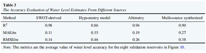 所有水库的整体精度评估显示,合成水位与原位数据相关性高(除鹤地水库R²=0.72外,其余均>0.88),MAE在0.11至0.46米之间(图10 和 表3 展示了不同数据源的反演精度对比,其中SWOT直接反演精度最高,测高模型法精度相对较低但换取了更高频率)。