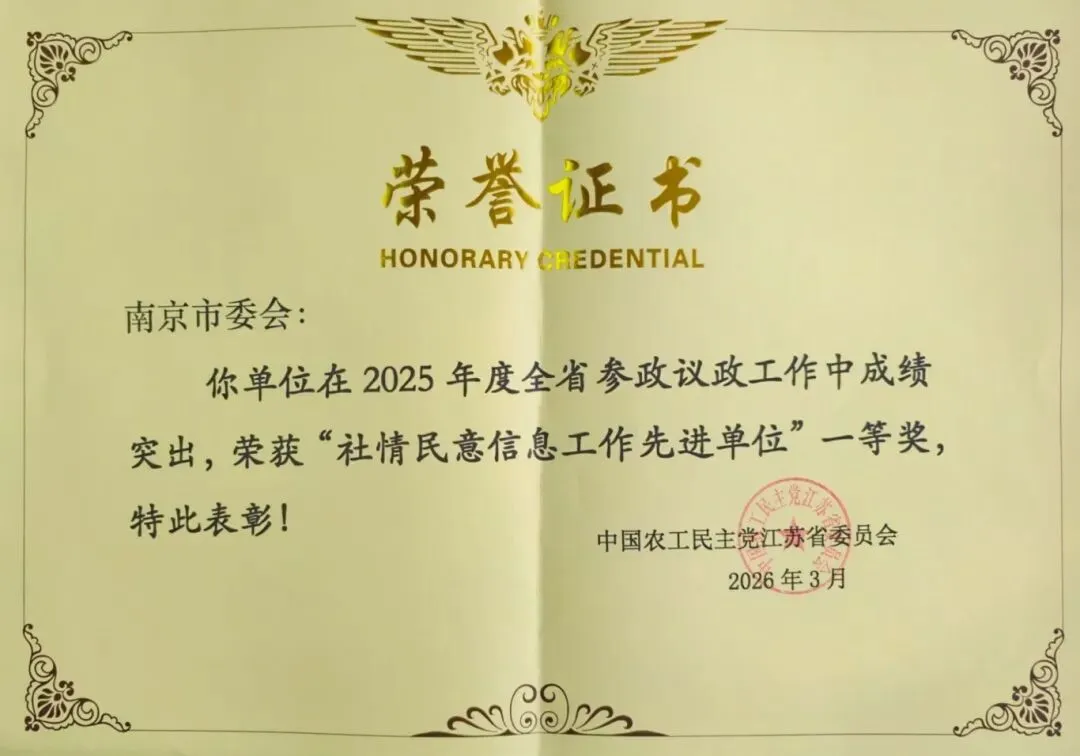 与此同时,在中共南京市委统战部的表彰中,农工党南京市委会信息工作继续名列全市各民主党派第一,获得2025年市委统战部“信息工作成绩优异单位”表彰。