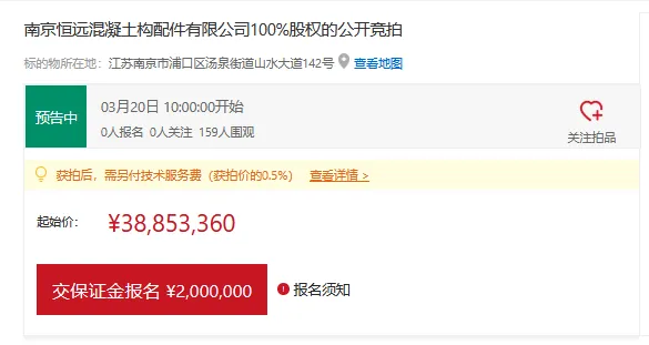 起始价3885.34万元!南京一混凝土公司100%即将竞拍!
