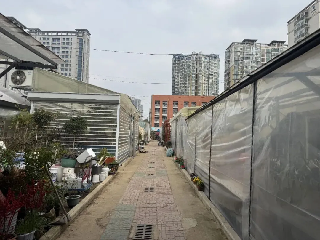 现在南京的天气还是有些寒冷,不少绿植花草还“待在”暖和的大棚里,这也是一户一户的,都有门牌和店名。