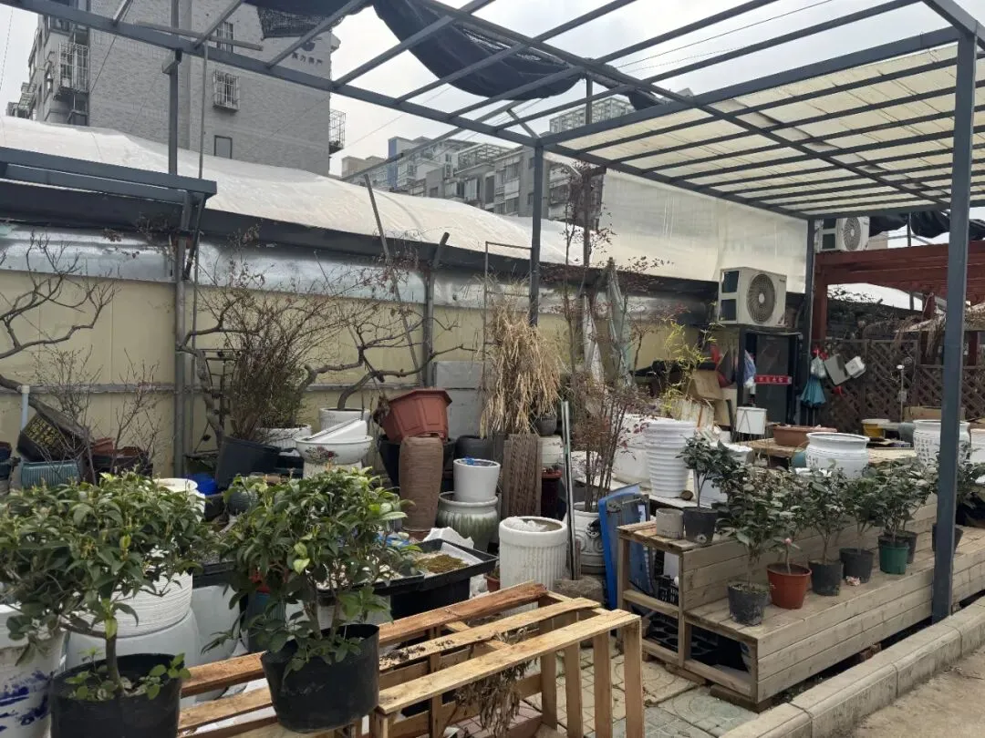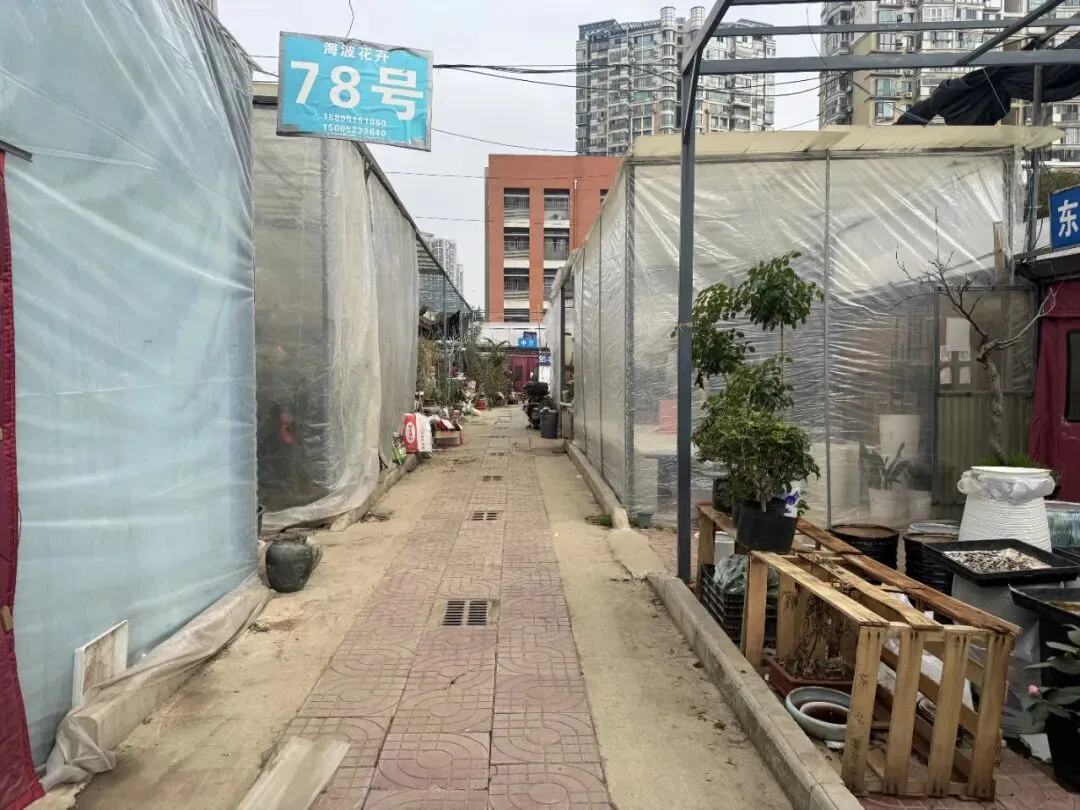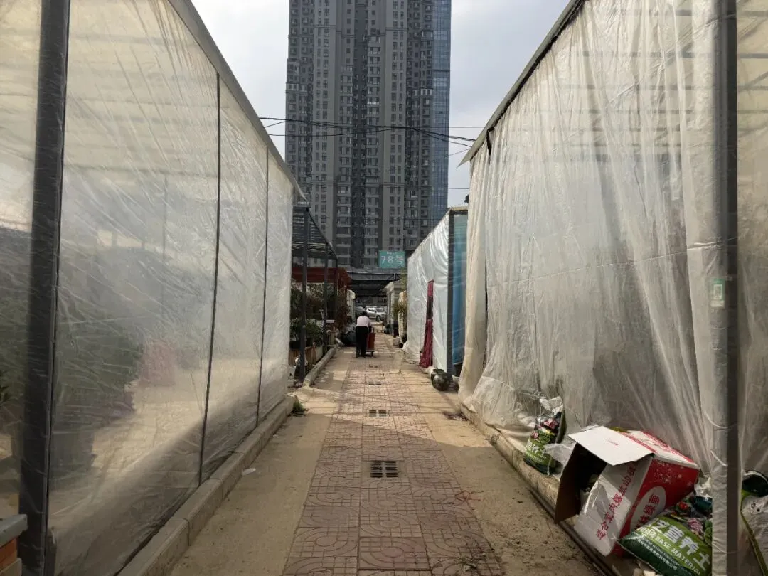 有一部分商户的棚子已经开始拆了,盆栽和花盆都随意的摆放着。